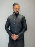 Pair with a crisp white or ivory kurta set for striking contrast, or go all-black for a bold and regal look. Complete the ensemble with mojaris or polished loafers. Add a pocket square or brooch for a refined finish.