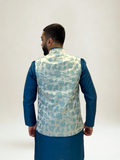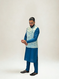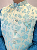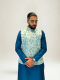 Refined and sophisticated, our Light Grey and Sky Blue Floral Nehru Jacket brings a refreshing blend of subtle elegance and striking detail. The light grey base paired with intricate sky blue floral motifs creates a timeless look that balances tradition with contemporary style.
