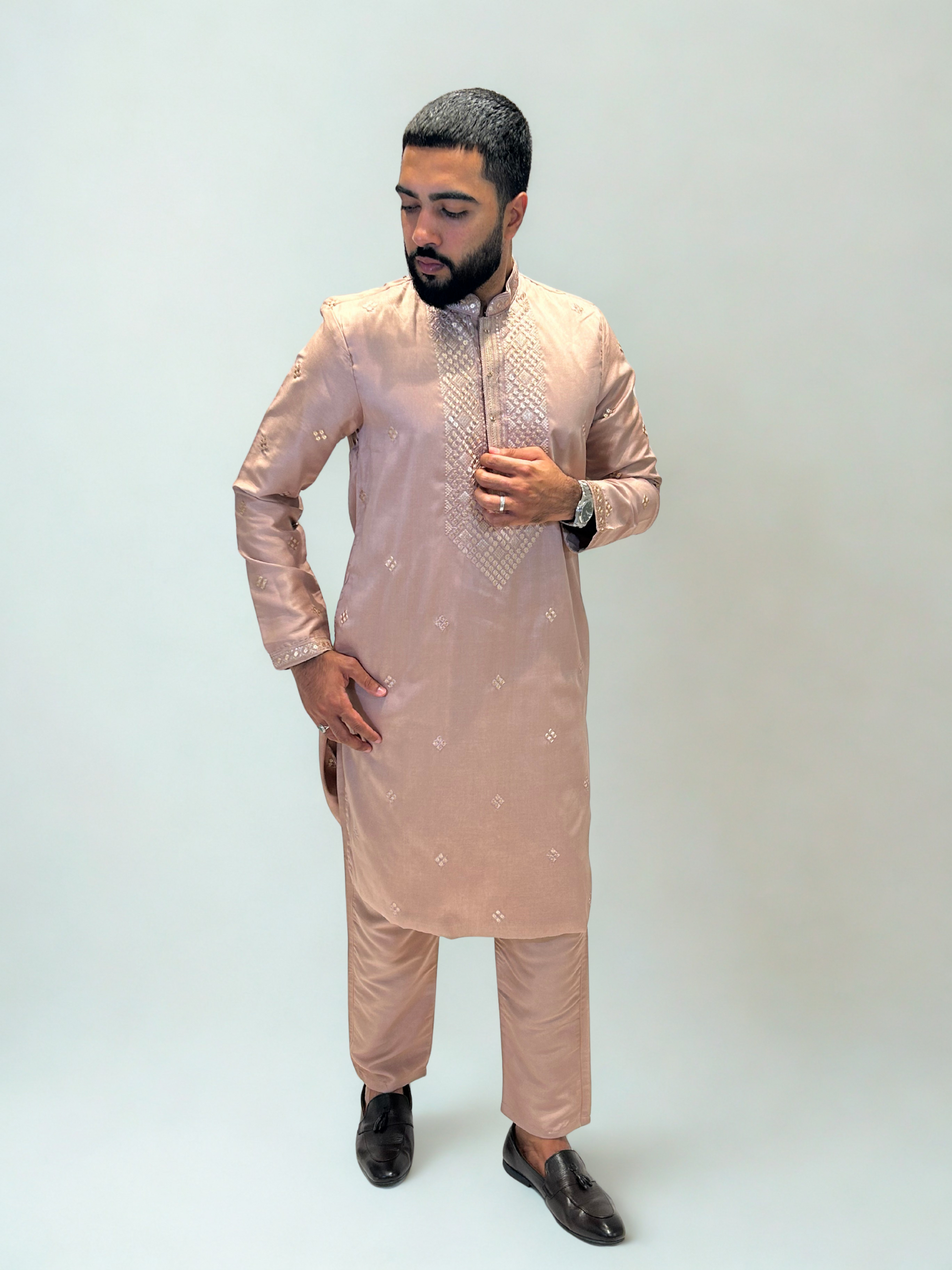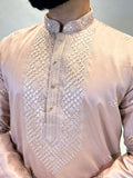 Bring charm and sophistication to any occasion with our Dusty Rose Embroidered Kurta Set. Crafted in a warm pastel rose shade with intricate tonal embroidery, this set offers a unique twist on classic festivewear.
