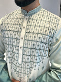 Make a bold and elegant statement with our Ivory & Teal Ombre Embroidered Kurta Set. This standout piece features a hand-crafted embroidered panel in rich teal over an ivory base, blending into a deep ombré fade that adds dimension and drama to the silhouette.
