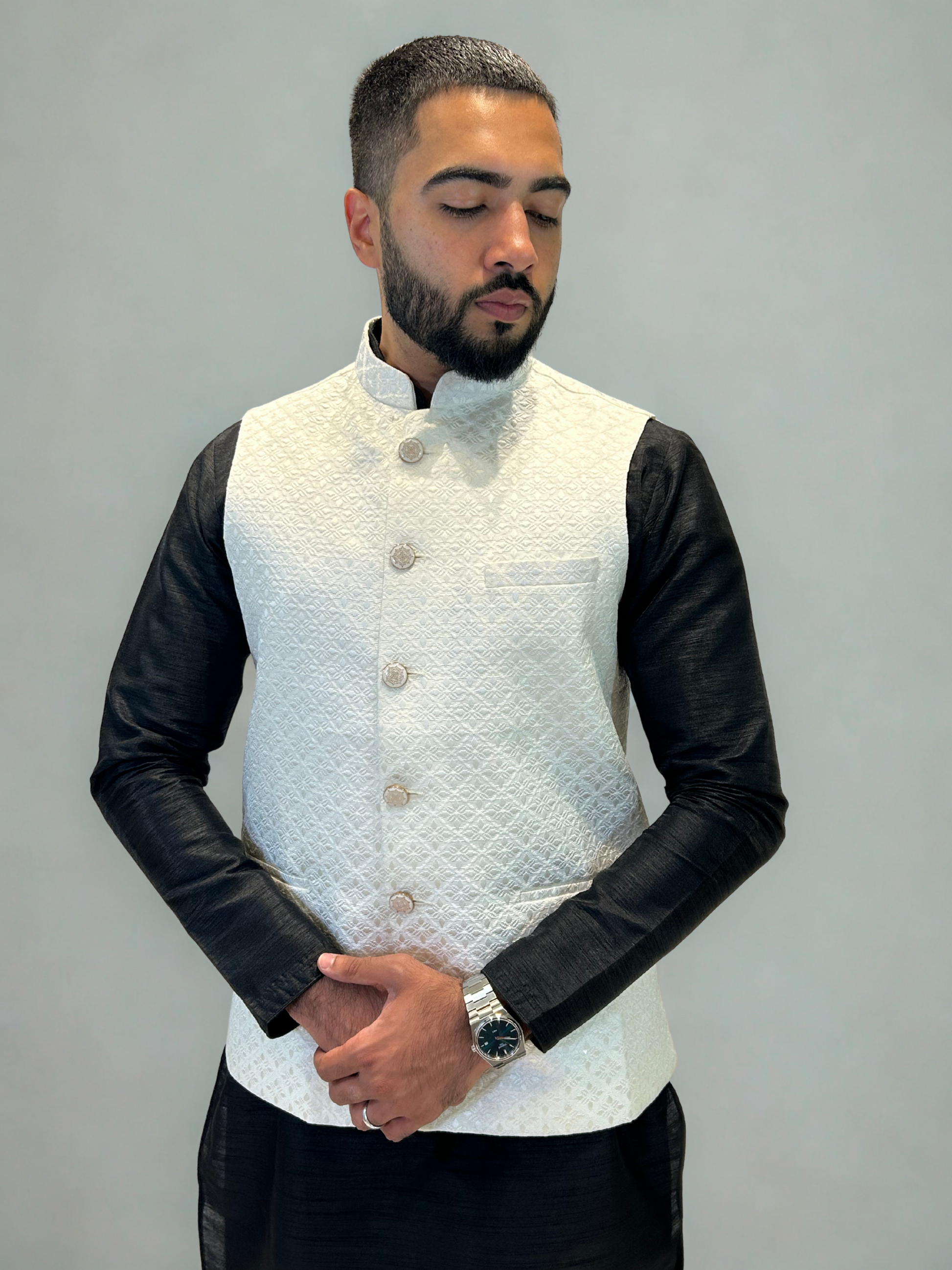 Pair over a black kurta set for contrast or layer with ivory for a monochrome look. Complement the jacket with mojaris or formal loafers. Add a subtle pocket square to complete the outfit.