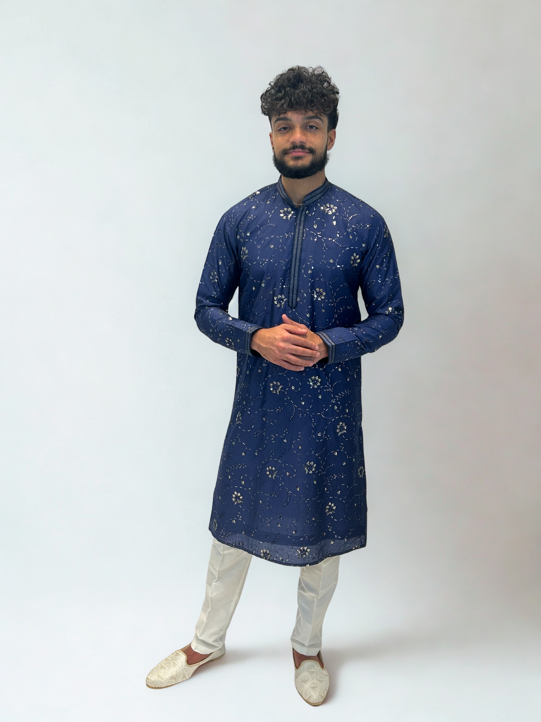 Sophisticated and statement-making, the Navy Blue Floral Embroidered Kurta Set is designed for timeless elegance....