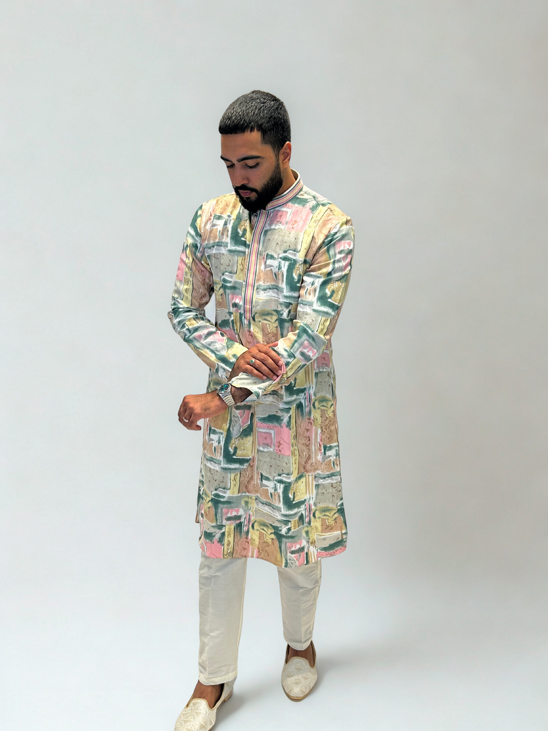 Make an unforgettable entrance with our Pastel Abstract Printed Kurta Set. Designed for the modern...