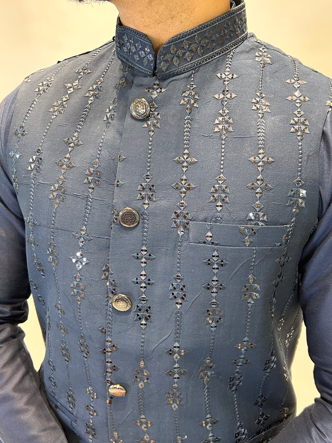 Refined and regal, our Silver Grey Embroidered Nehru Jacket brings a touch of modern luxury...