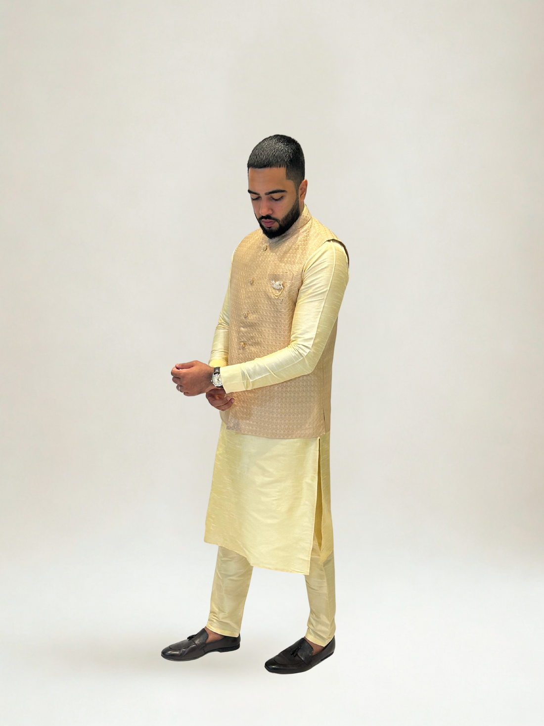 Refined and luminous, our Peachy Gold Self Patterned Nehru Jacket captures the warmth of peach...