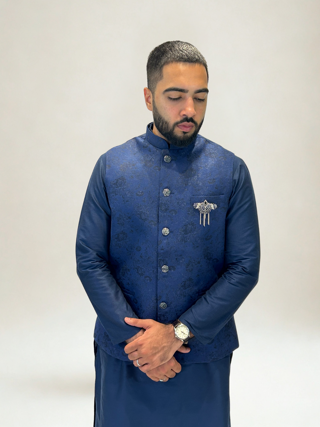 Distinguished and refined, our Navy Floral Jacquard Nehru Jacket is designed to bring timeless elegance...