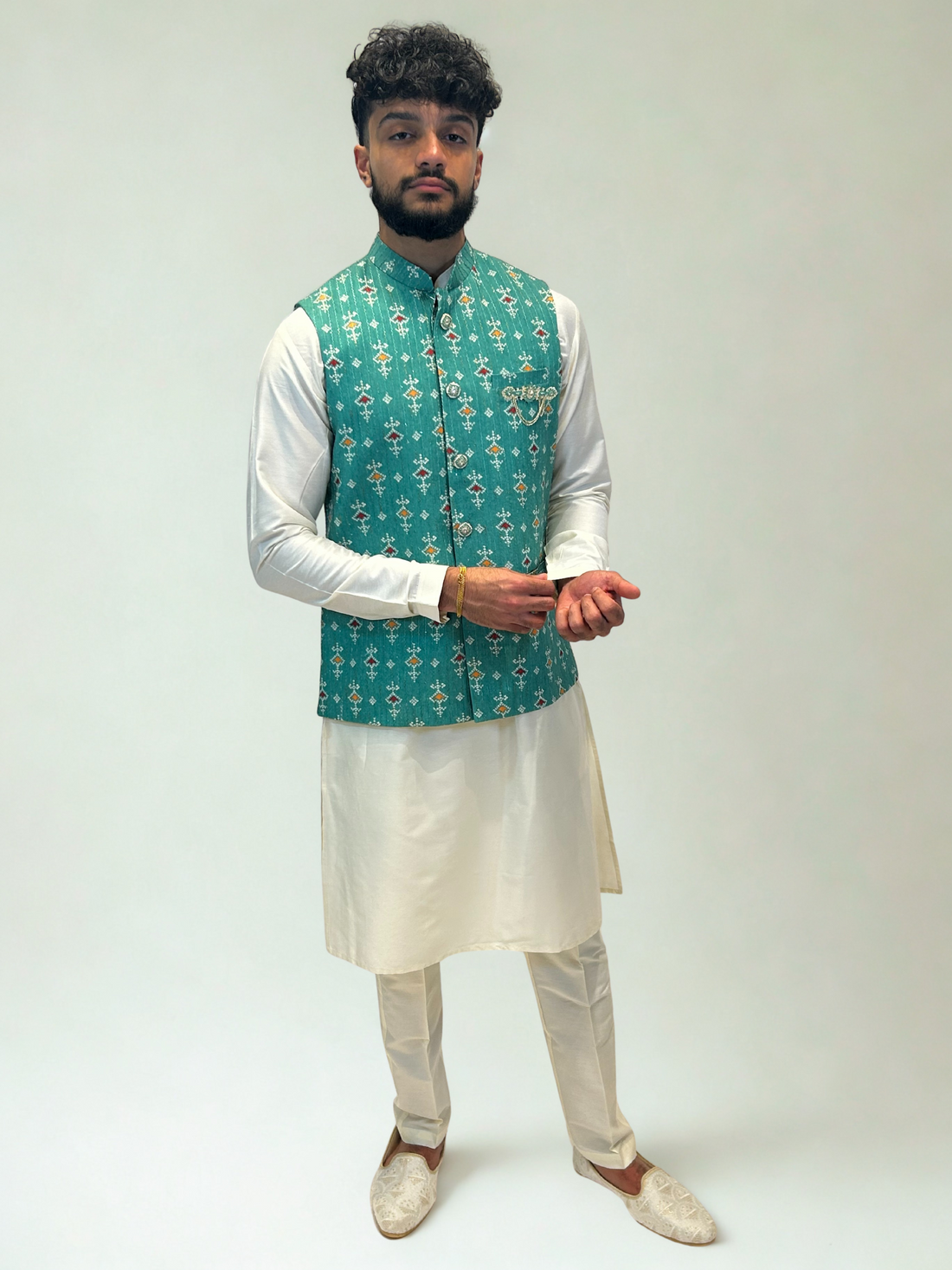 Vibrant yet refined, the Teal Green Embroidered Textured Nehru Jacket adds a touch of festive...