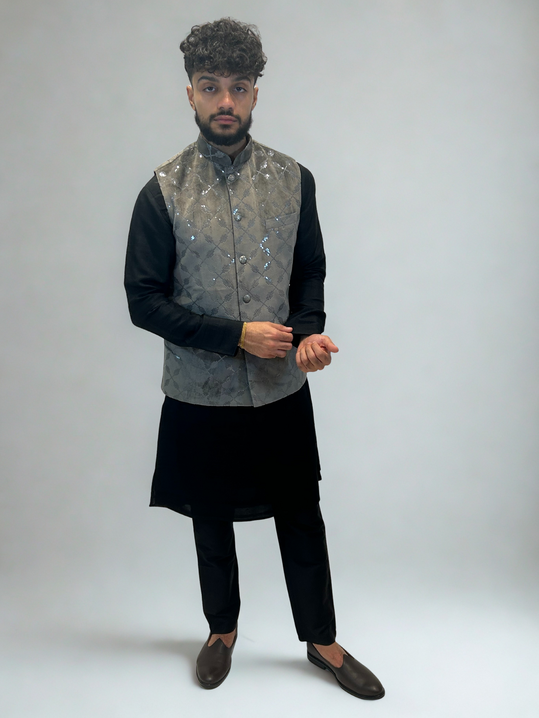 Luxurious and refined, the Silver Grey Velvet Sequin Nehru Jacket brings timeless sophistication with a...