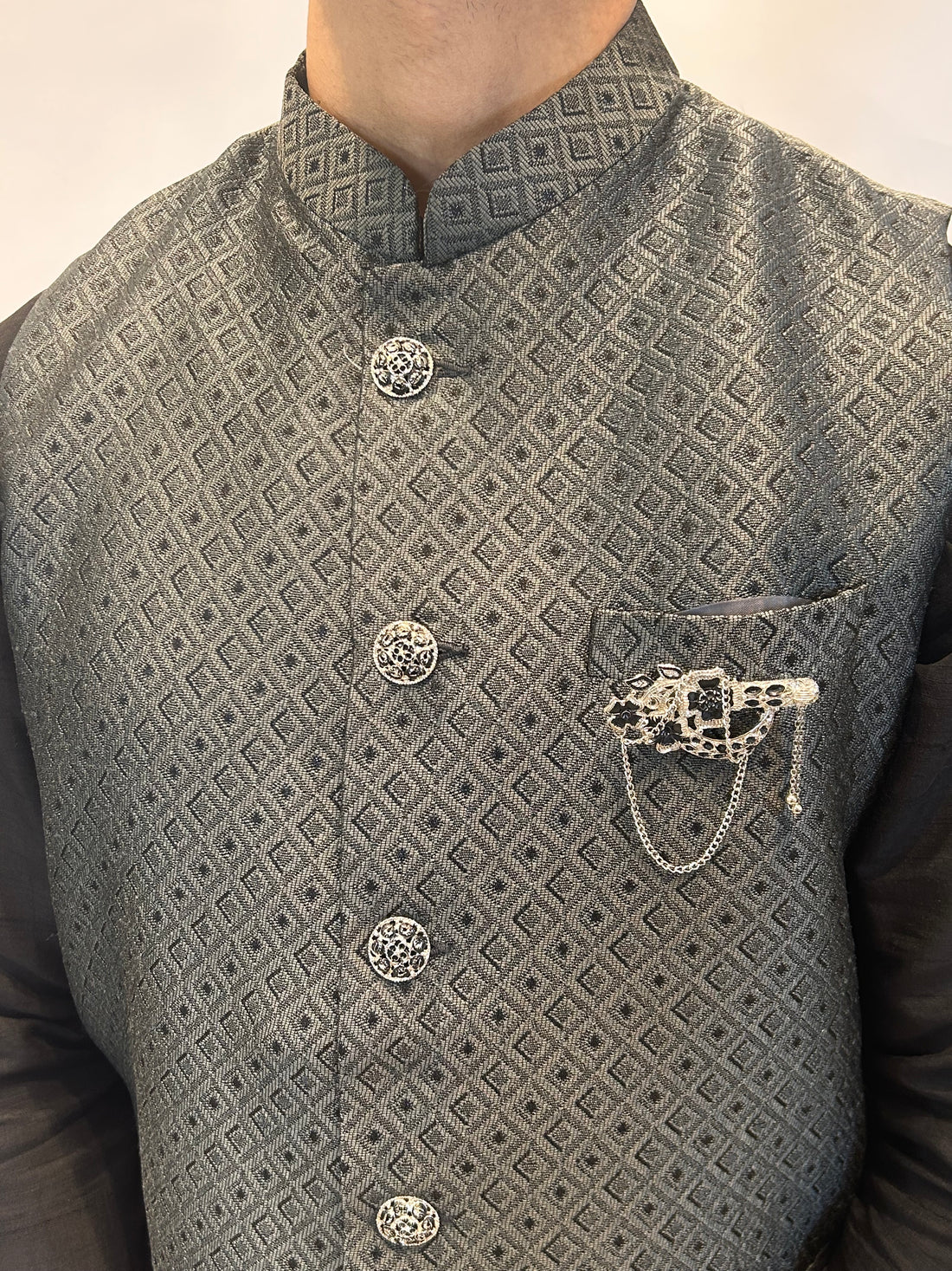 Make a statement in our Silver Grey Patterned Nehru Jacket. Crafted with an intricate woven...