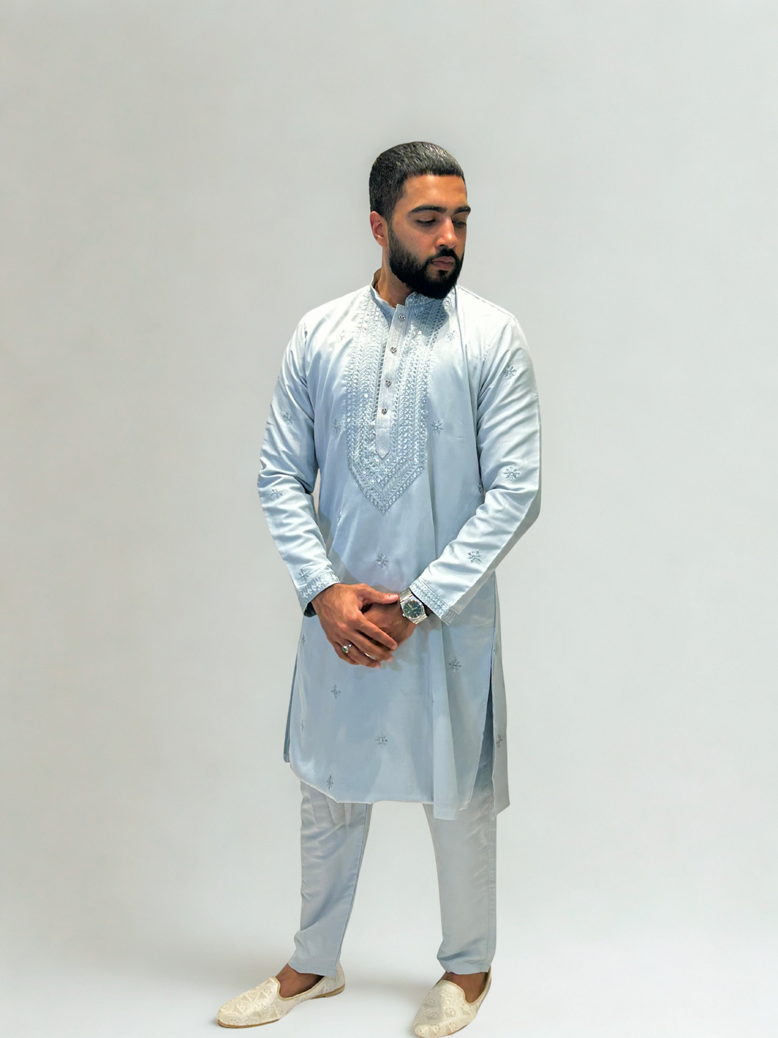 - Design: Subtle shimmer with elegant embroidered placket and mandarin collar