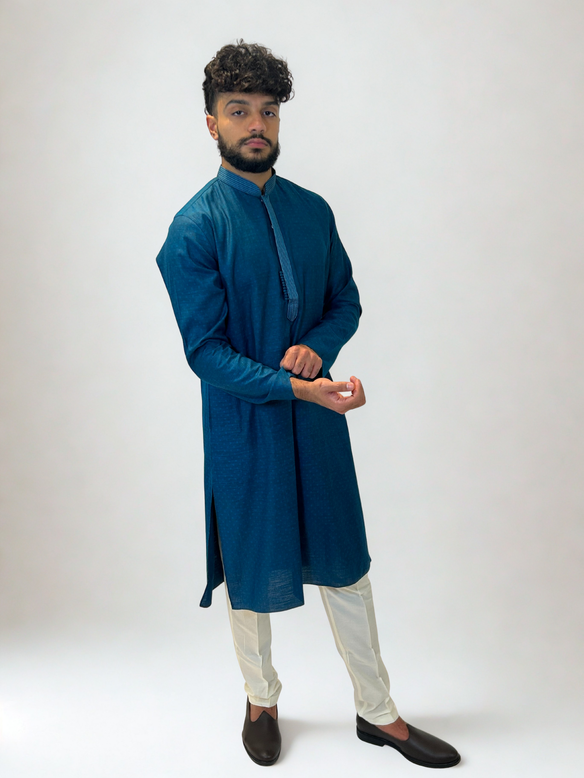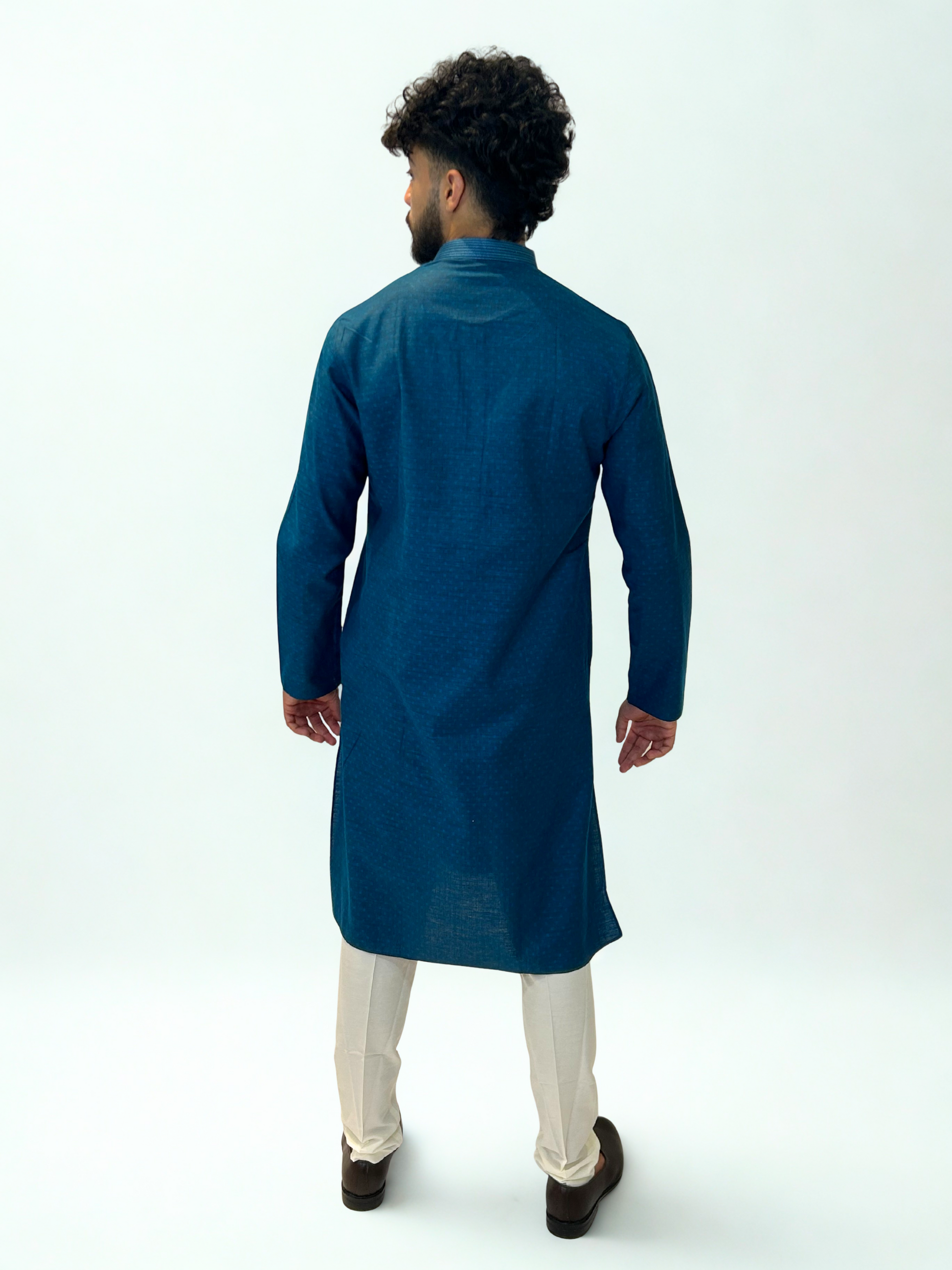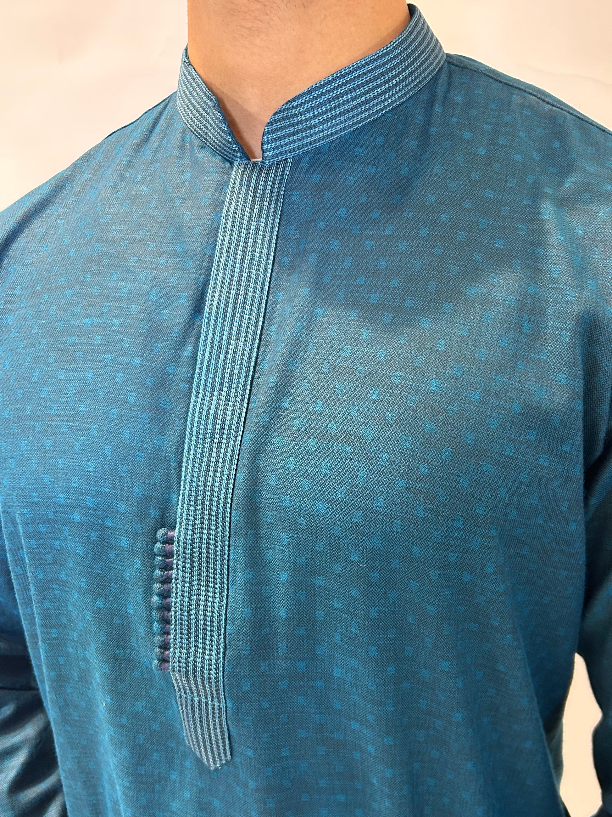 Minimal yet striking, the Teal Textured Kurta Set reflects effortless elegance with its refined tone and clean design. Crafted from a lightweight woven fabric with a subtle dotted texture, this piece combines everyday comfort with festive sophistication.