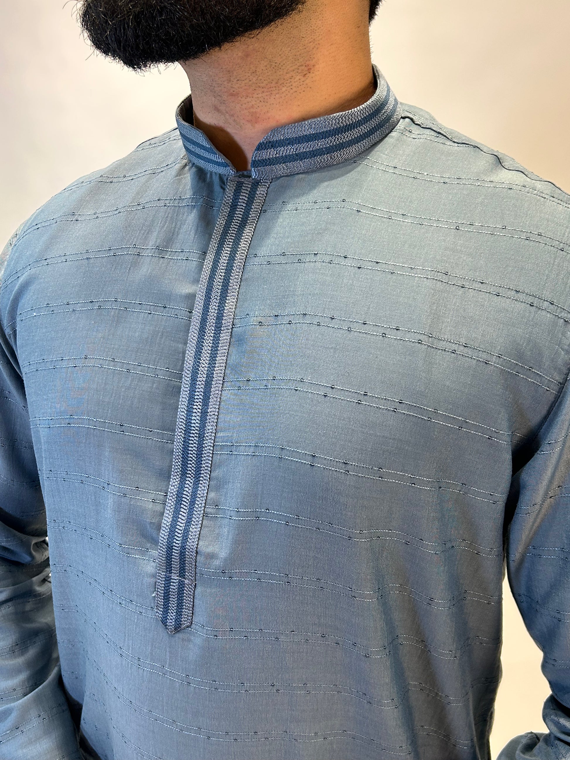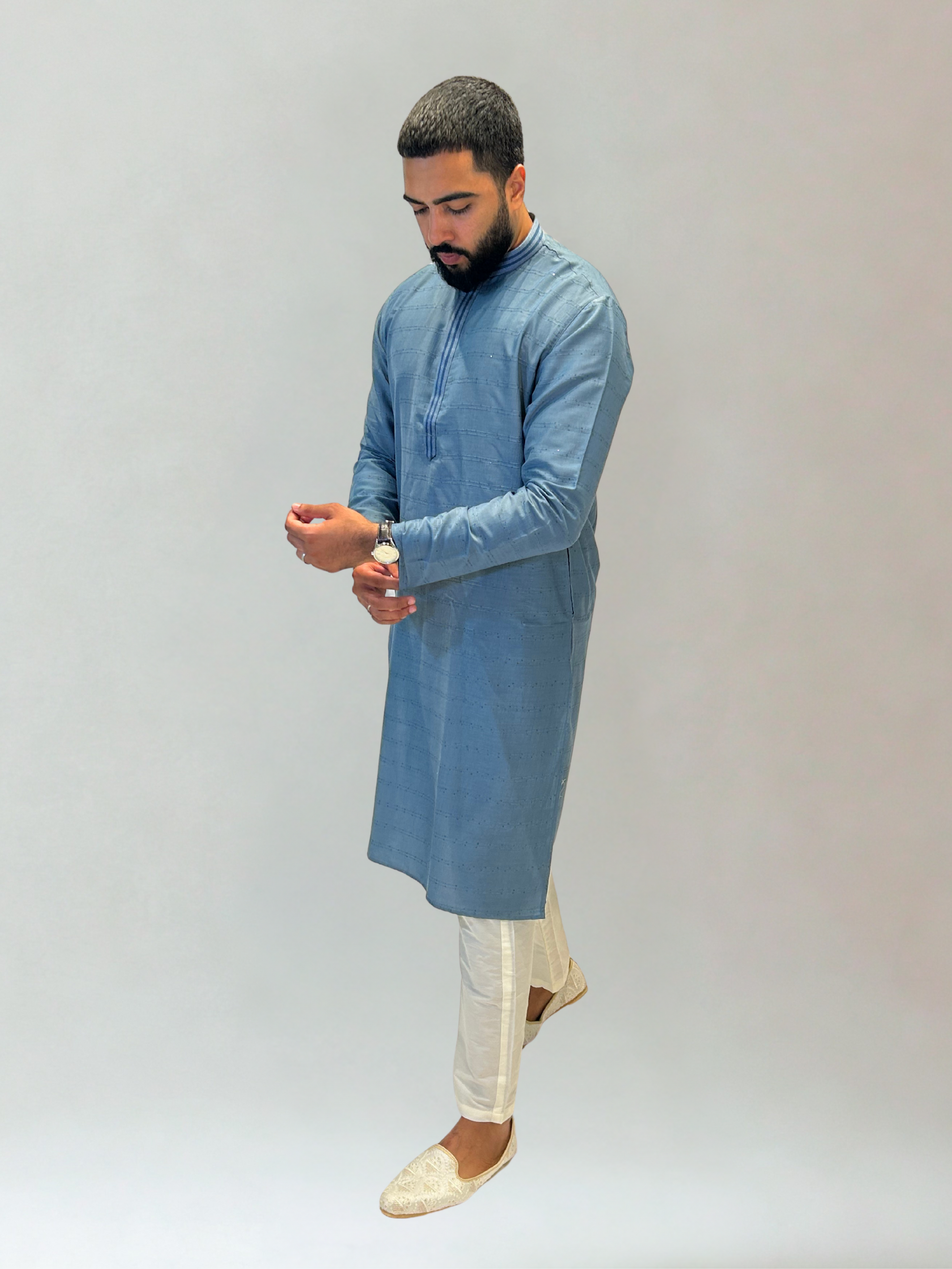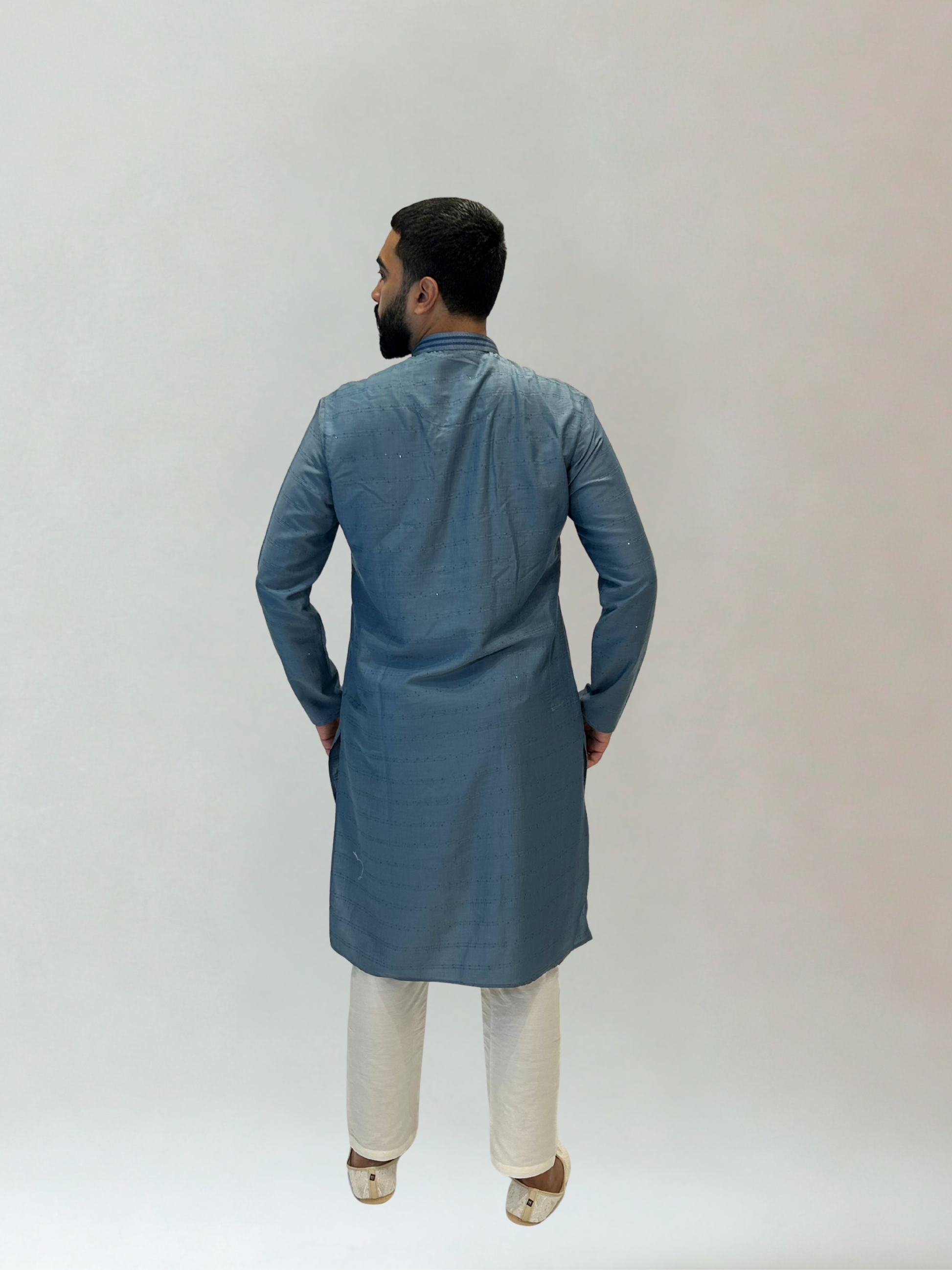 Step into modern sophistication with our Grey Blue Thread and Sequin Kurta Set. This refined ensemble features a muted grey-blue base, accented with linear threadwork and subtle sequin highlights that add a soft shimmer. The clean tailoring makes it versatile for both festive and formal occasions.
