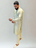 Elegant and timeless, this Light Gold Textured Kurta Pajama Set exudes understated luxury. The subtle woven texture paired with ornate buttons and an embellished band collar creates a regal yet refined look that works effortlessly for both day and evening wear.