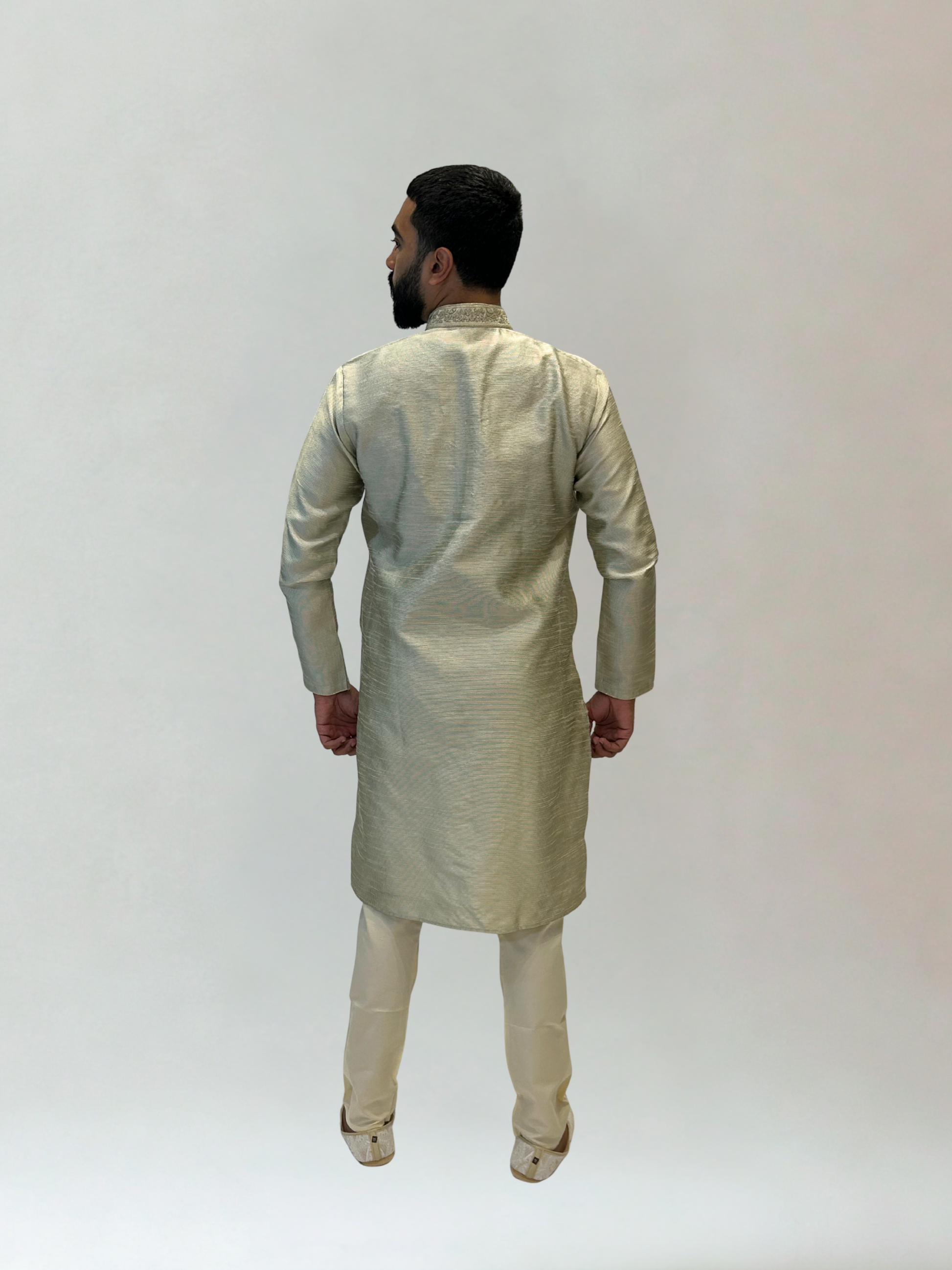 This Light Gold Kurta Pajama Set is a versatile statement piece that blends modern refinement with traditional charm.