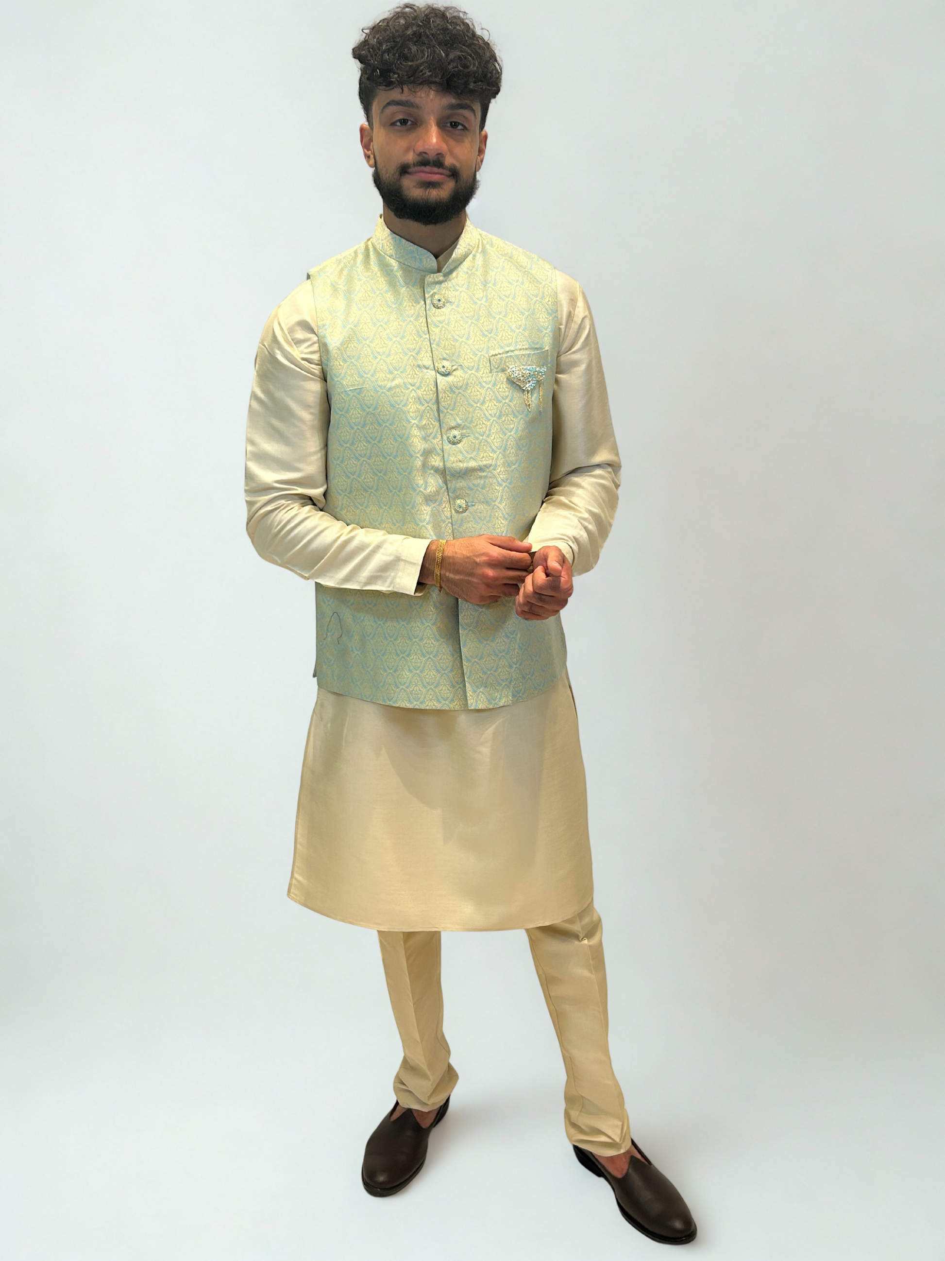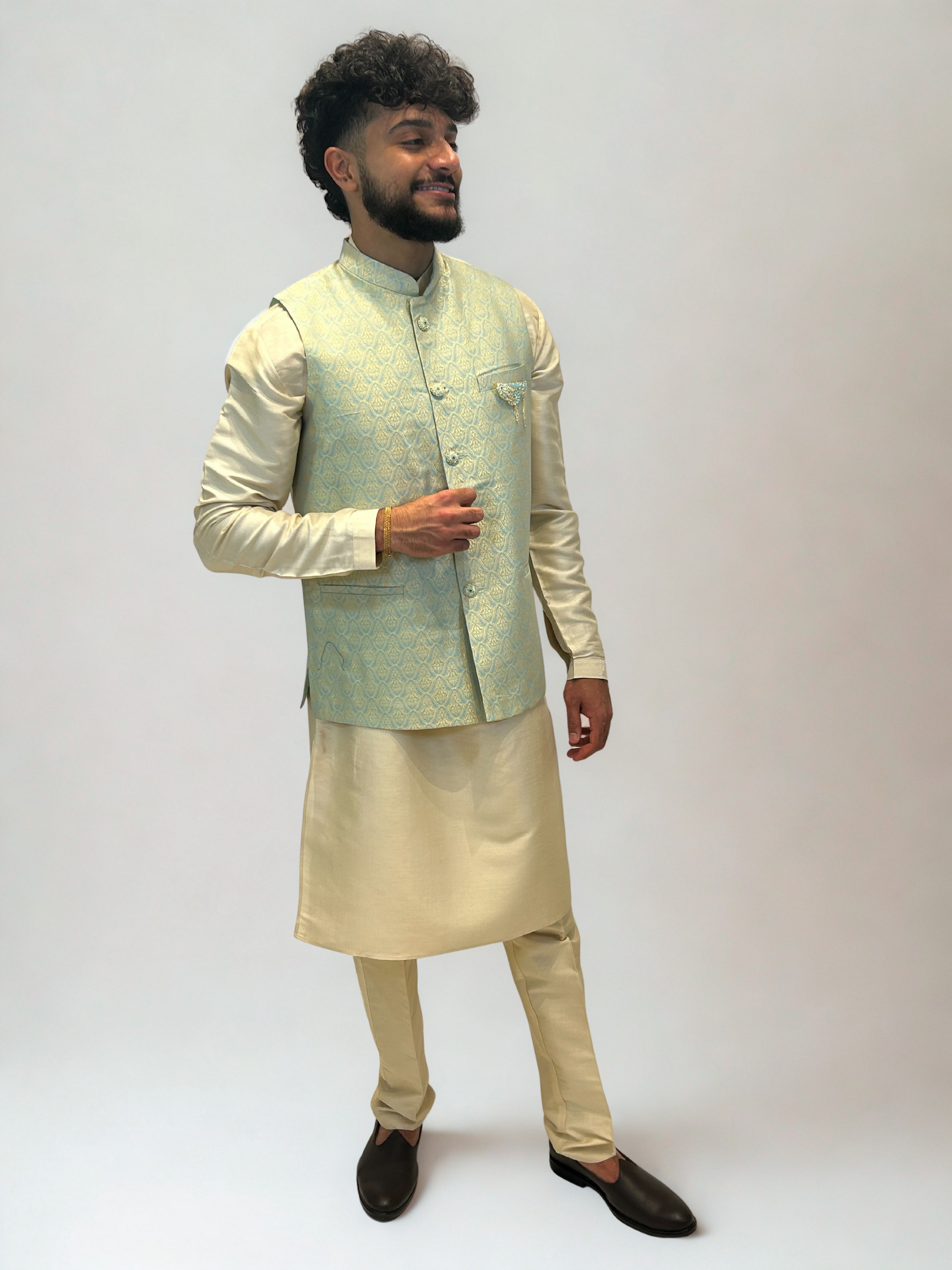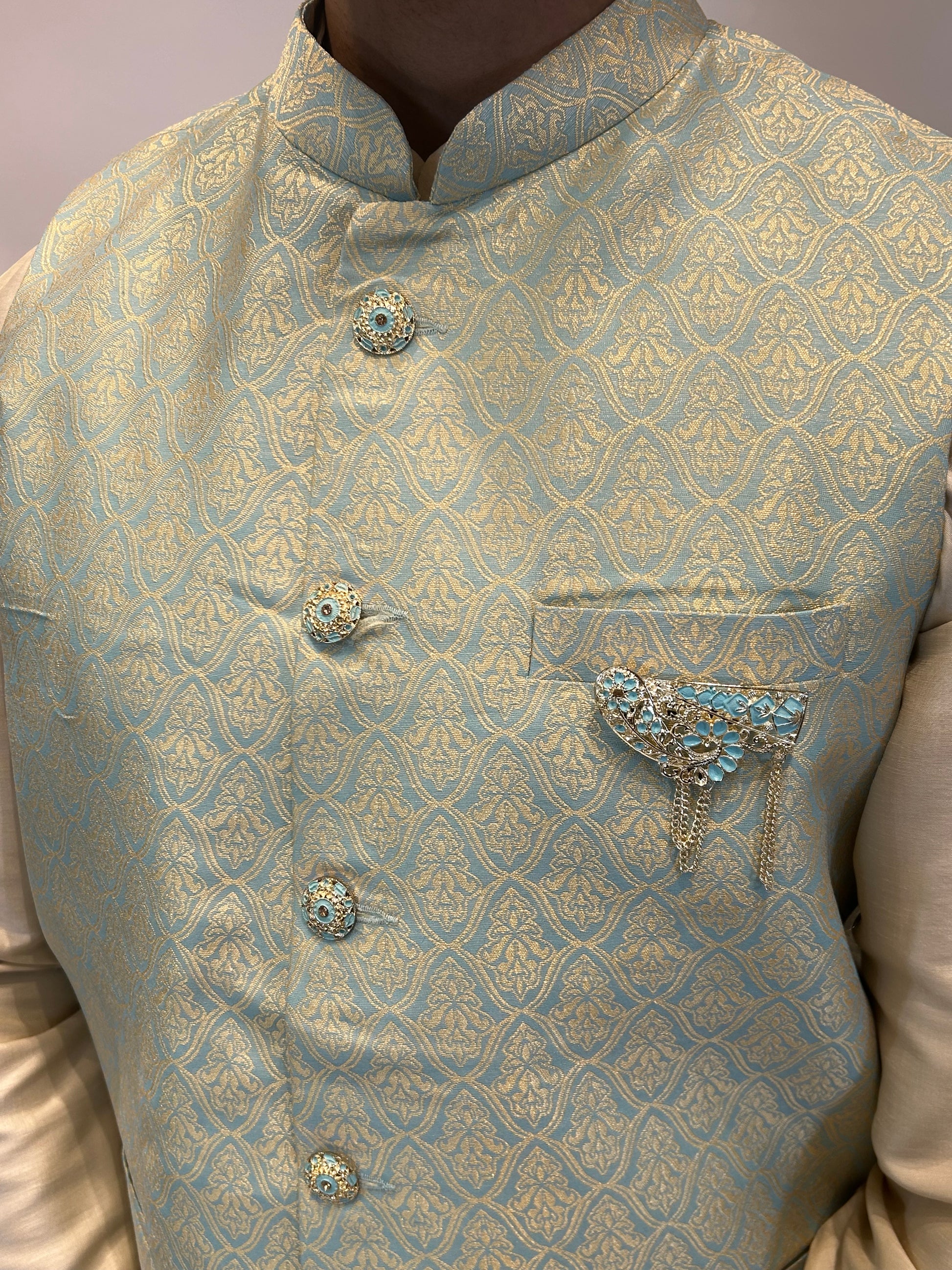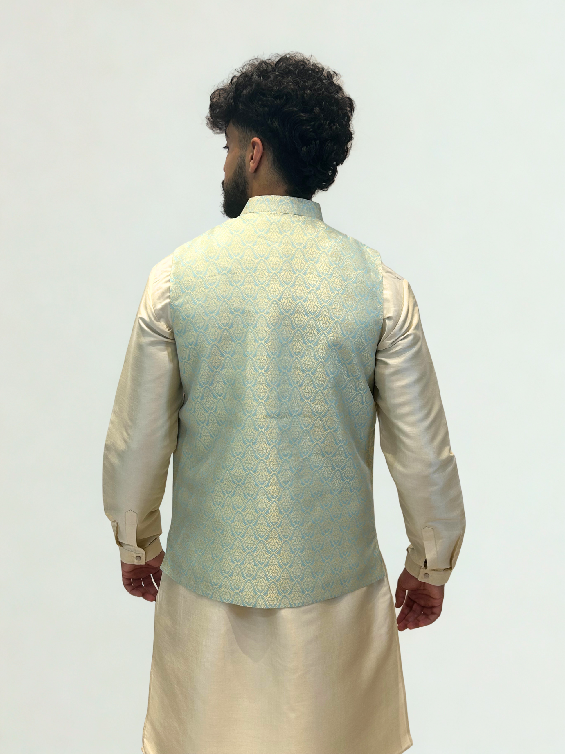 Elegant and modern, the Mint Gold Brocade Nehru Jacket exudes a subtle charm that bridges tradition and sophistication. The soft mint hue paired with intricate gold woven detailing creates a refined ensemble ideal for festive and formal occasions alike.