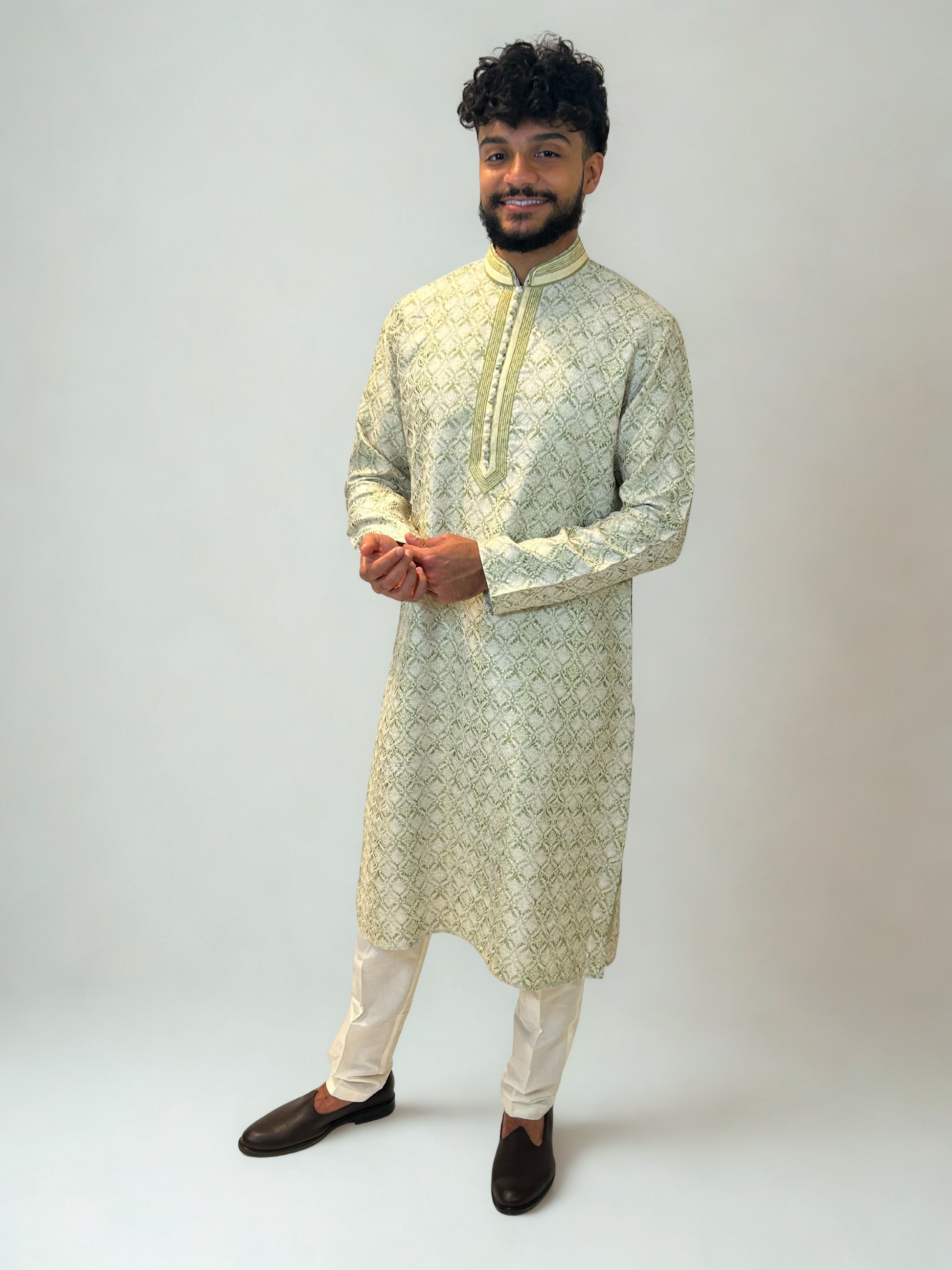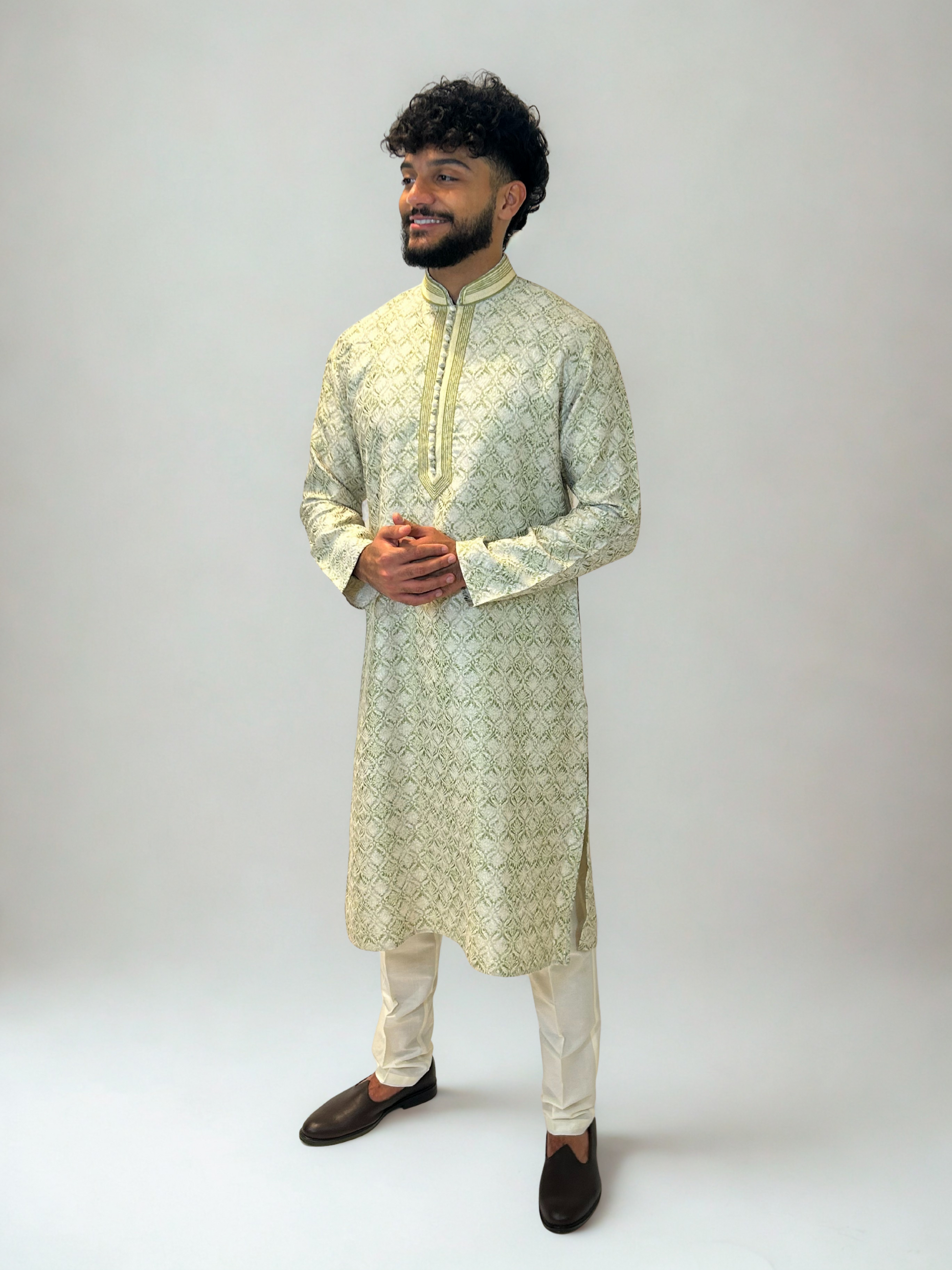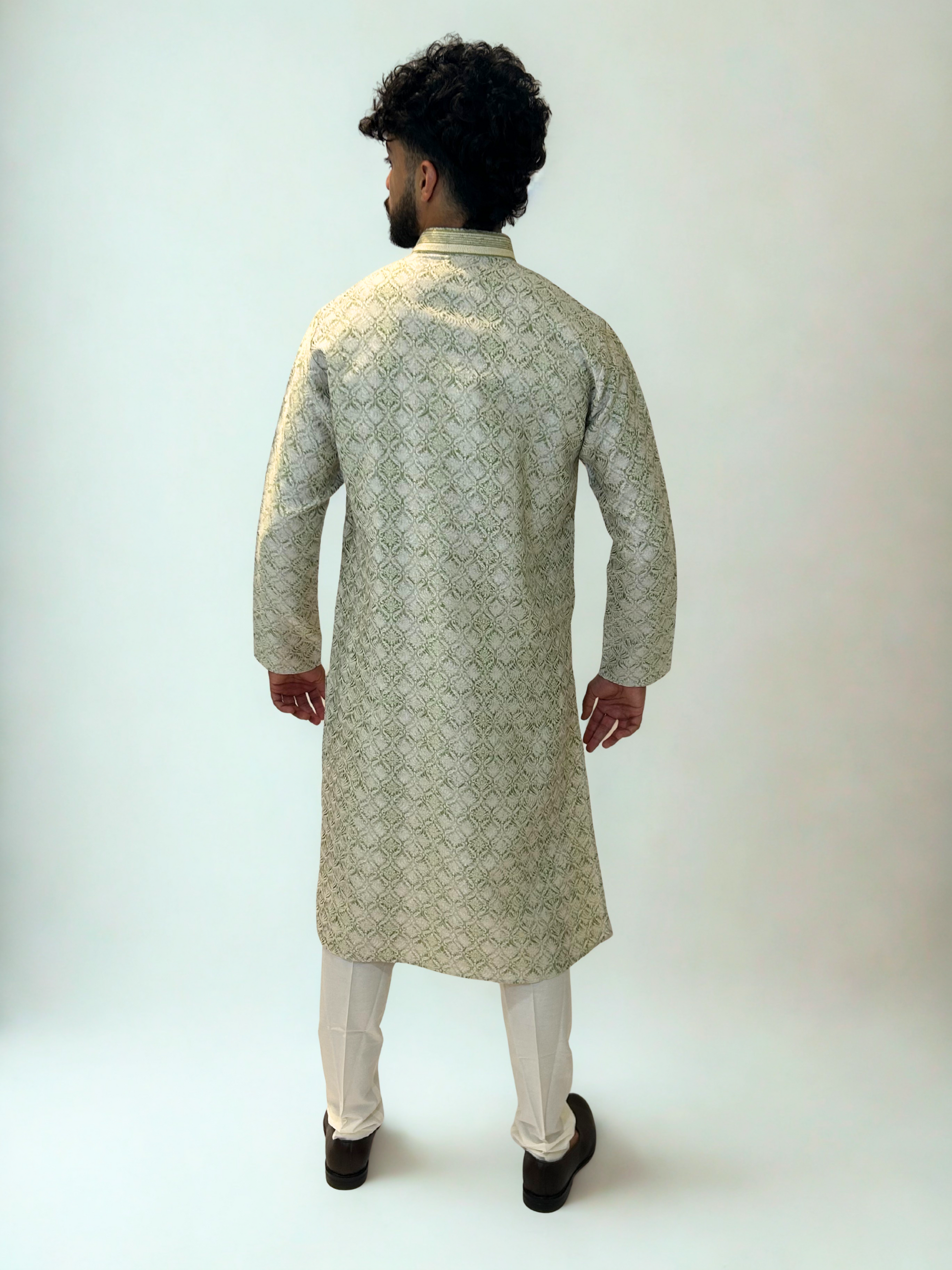 Elegant and timeless, the Pastel Green Brocade Textured Kurta Set blends refined detailing with subtle sheen. Designed in a rich woven fabric with hints of gold and green, it exudes festive charm while maintaining a sophisticated, modern edge.