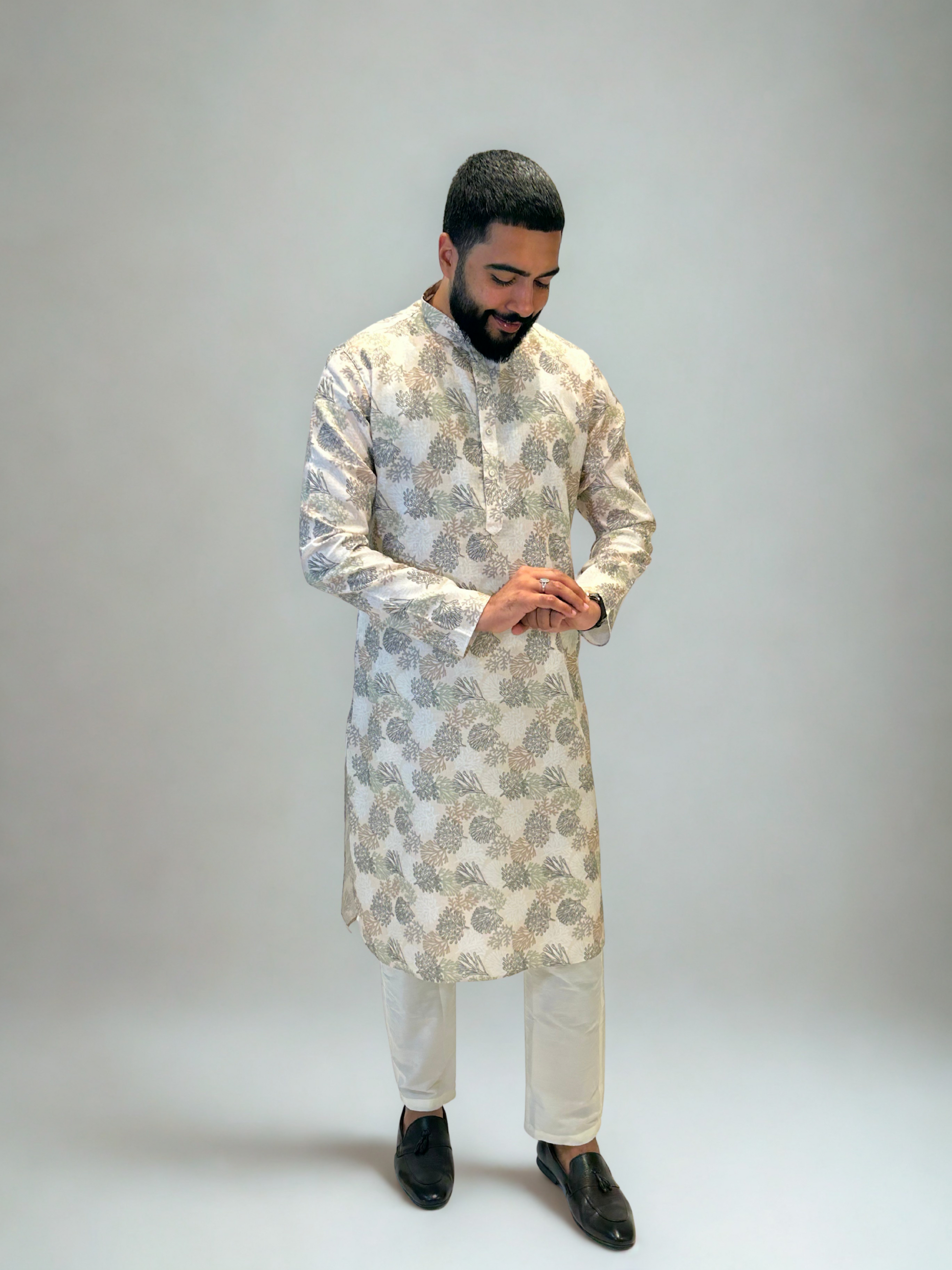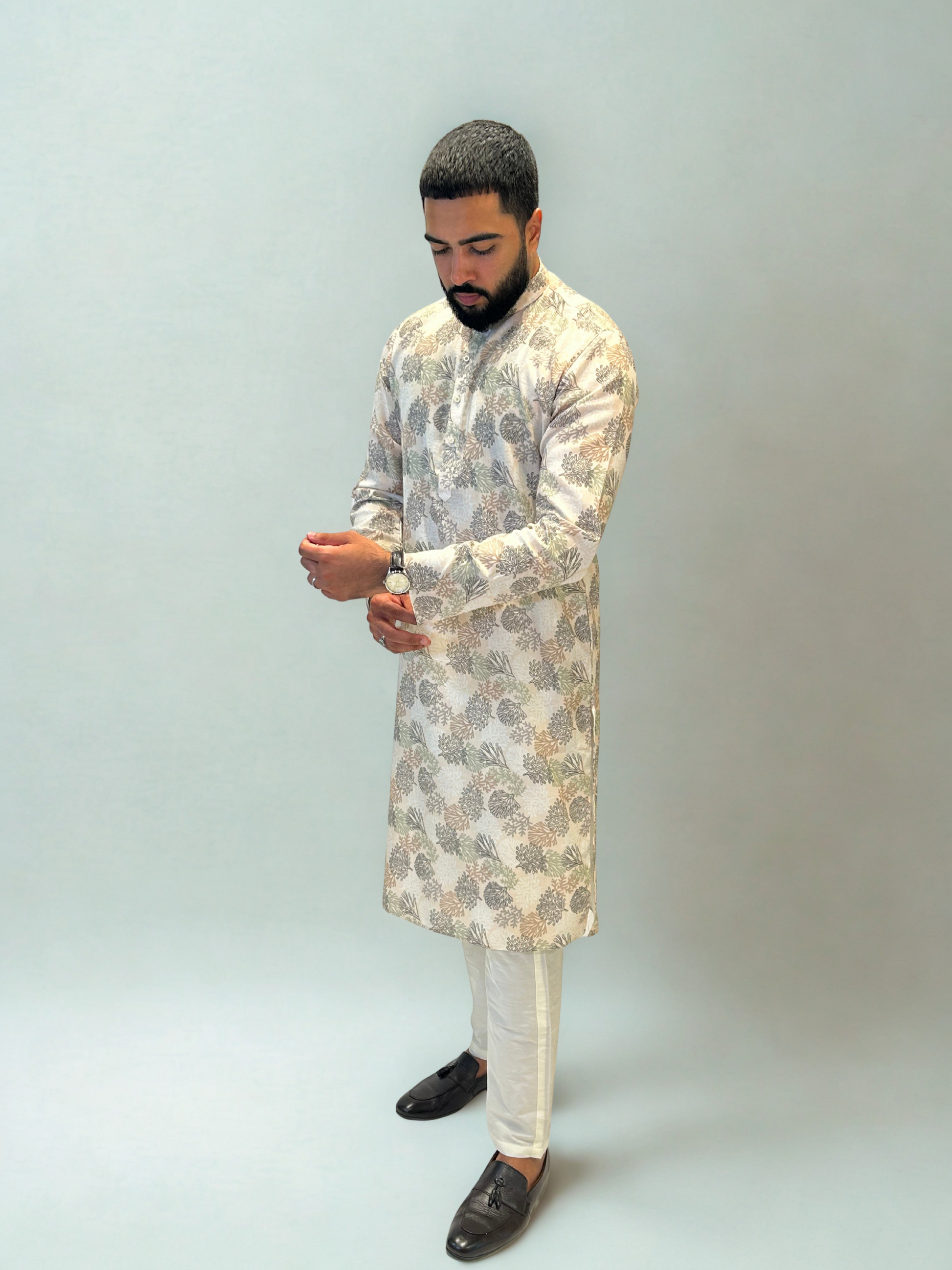 The kurta should fall comfortably around the chest and shoulders with enough room for easy movement. Pajamas are designed to taper towards the ankle for a clean and polished silhouette.