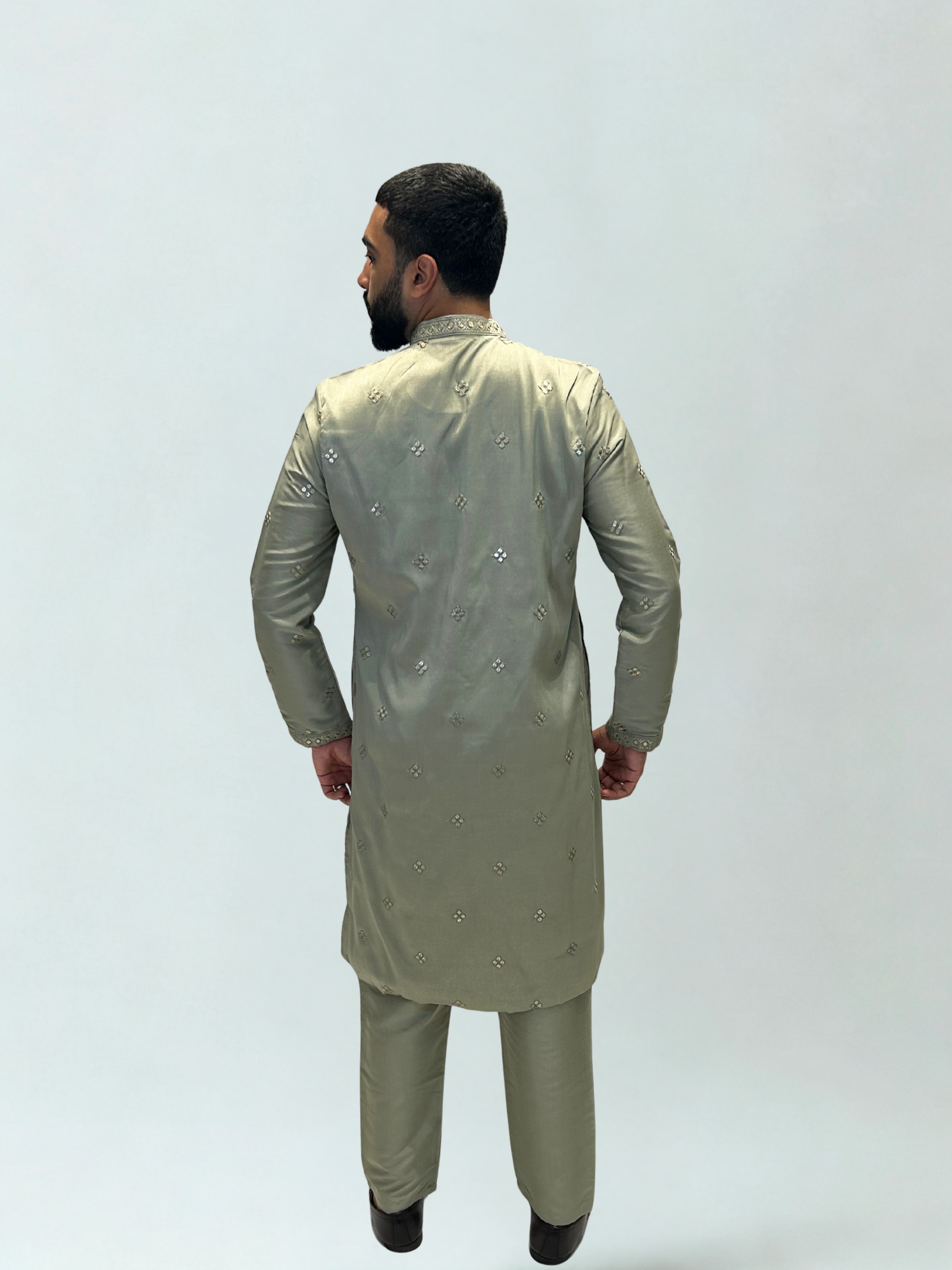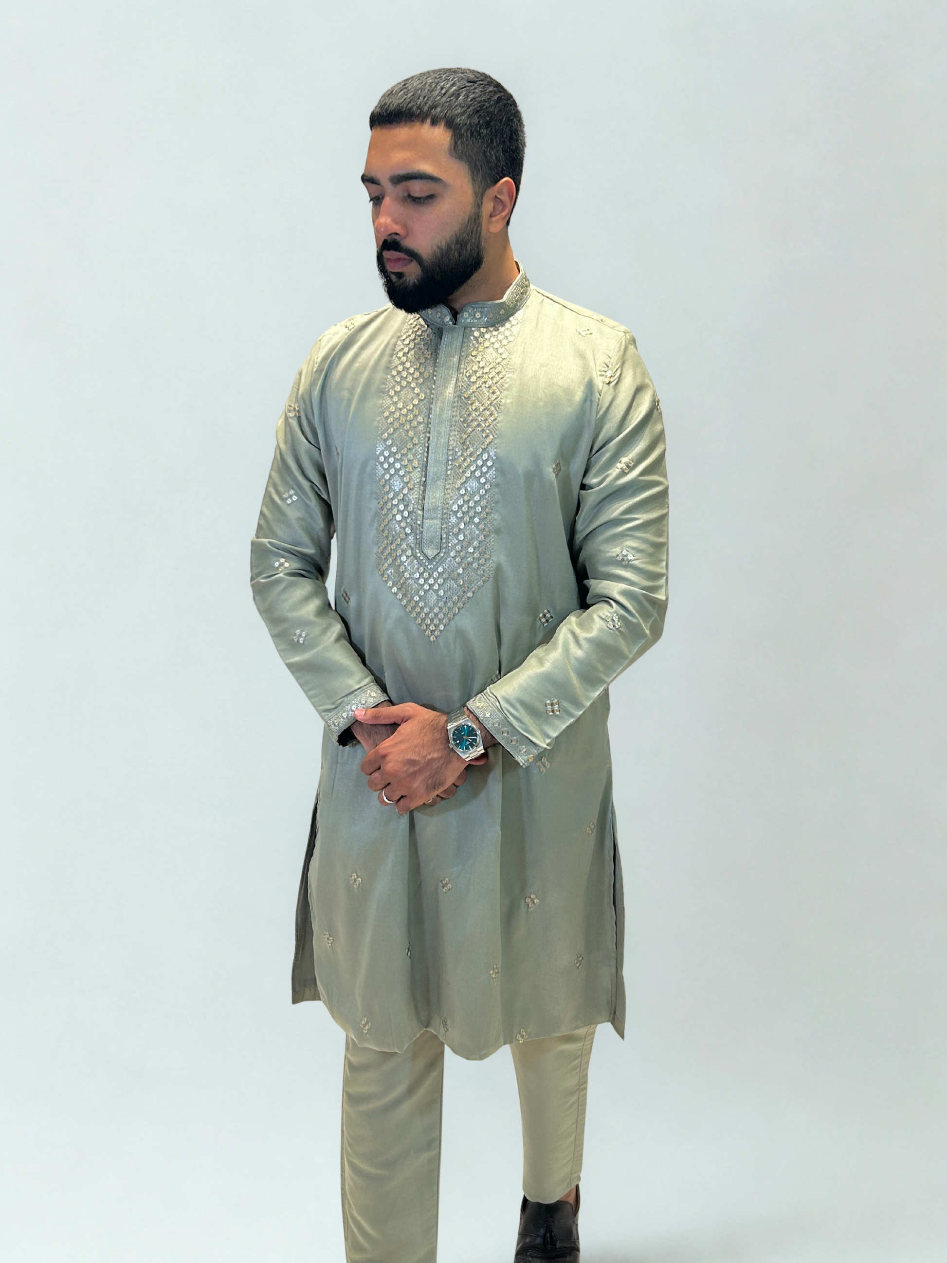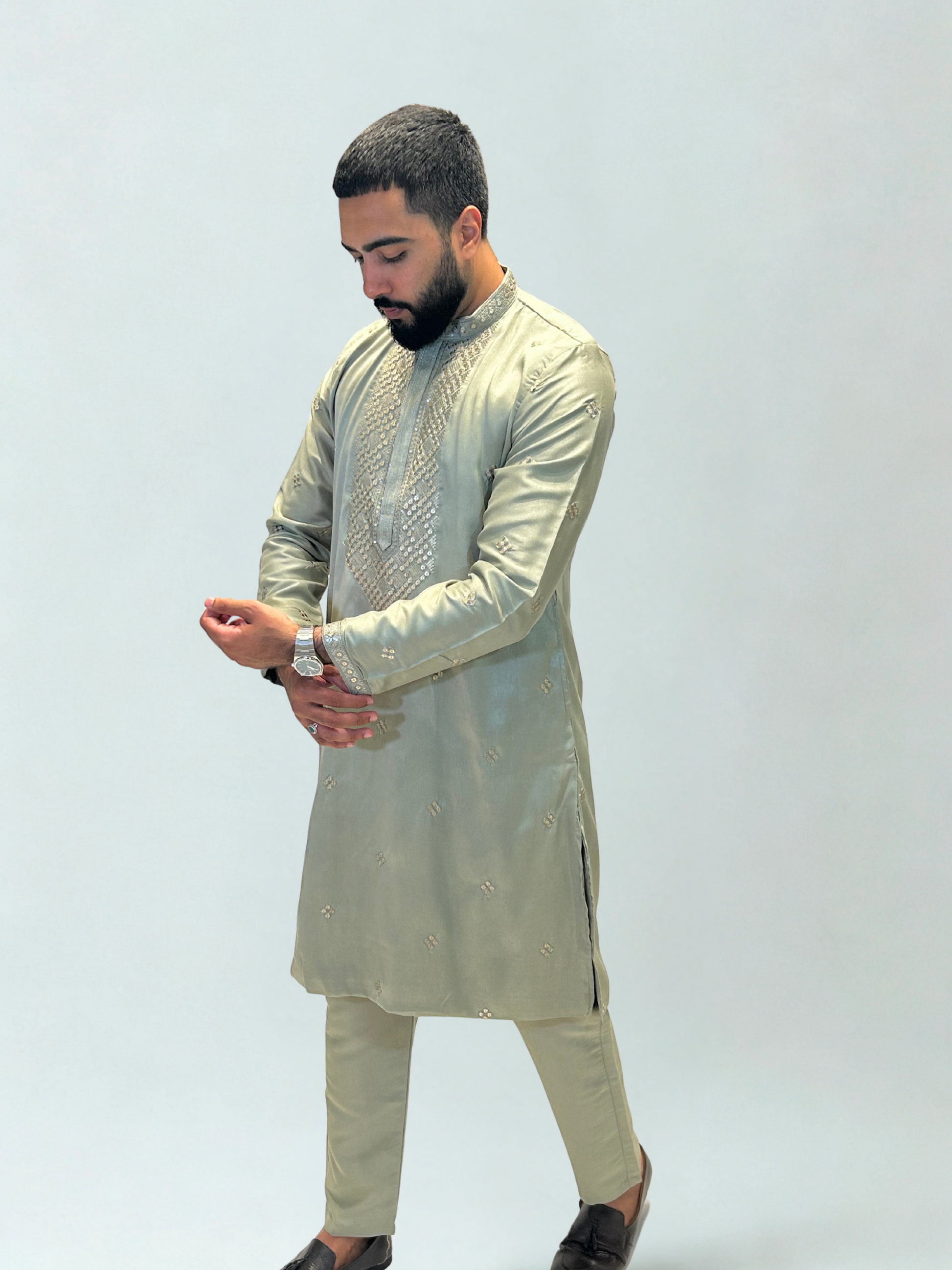 Make a subtle yet striking impression with our Sage Green Embroidered Kurta Set. Designed in a refreshing sage tone and adorned with delicate tonal embroidery, this set offers timeless elegance for weddings, festive events, and cultural gatherings.