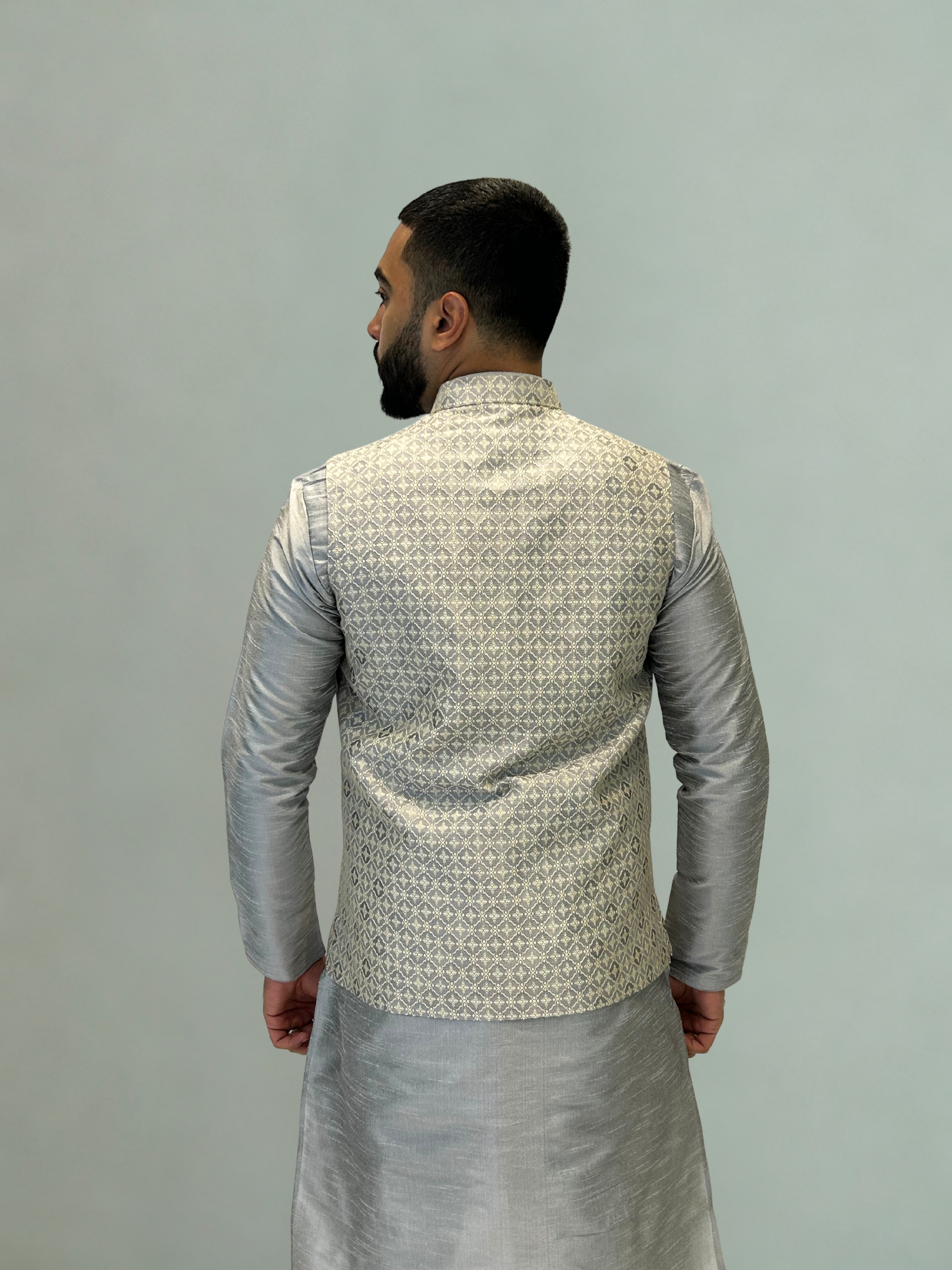 Make a statement in our Silver Grey Patterned Nehru Jacket. Crafted with an intricate woven geometric design, this jacket combines elegance with a modern finish. The subtle sheen of the fabric enhances its refined look, making it ideal for both daytime festivities and evening occasions.