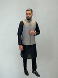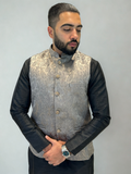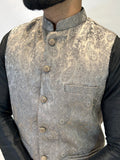 Make a statement in our Grey Paisley Patterned Nehru Jacket. Crafted in a sophisticated grey tone, this jacket features an all-over paisley motif with subtle woven detailing. Accented with ornate metallic buttons and a refined band collar, it’s a versatile piece that brings elegance to both festive and formal looks.