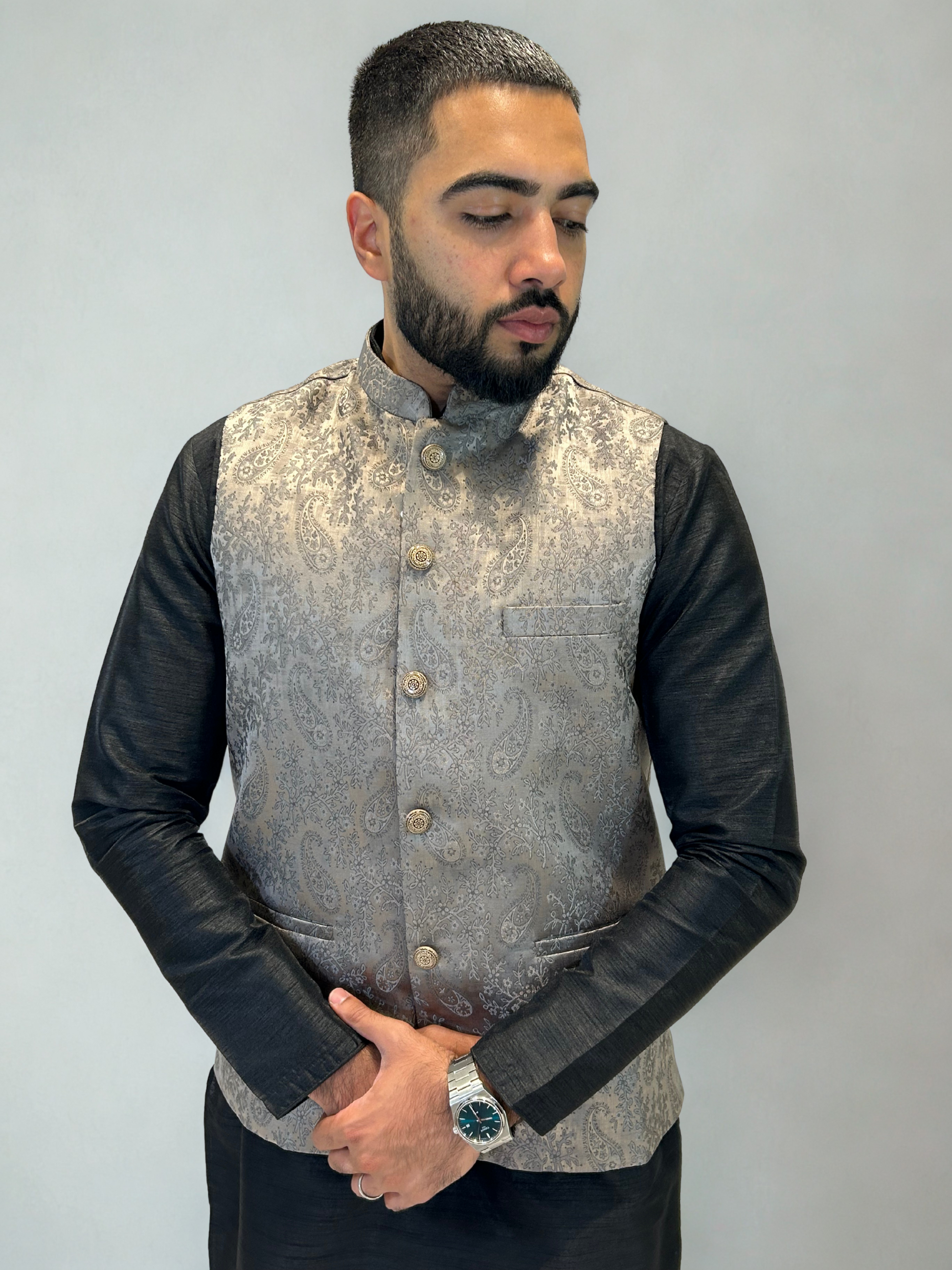 Elegant and versatile, this paisley patterned Nehru jacket is the perfect layering piece for the modern gentleman’s wardrobe.