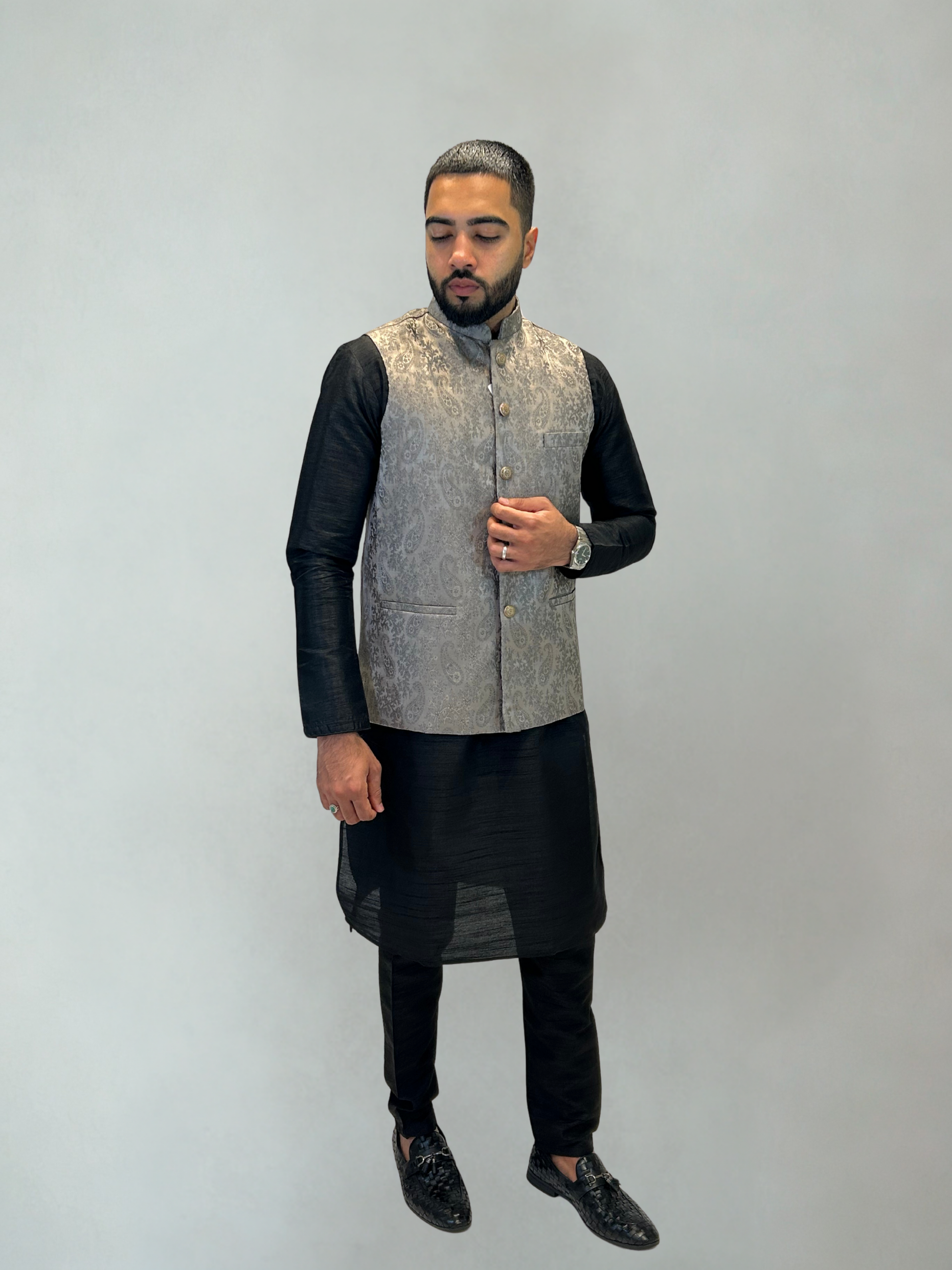 Pair over a black kurta set for a bold, formal look or layer with ivory for a softer contrast. Add classic mojaris or polished loafers to complete the outfit. A pocket square in deep maroon or navy enhances the regal finish.