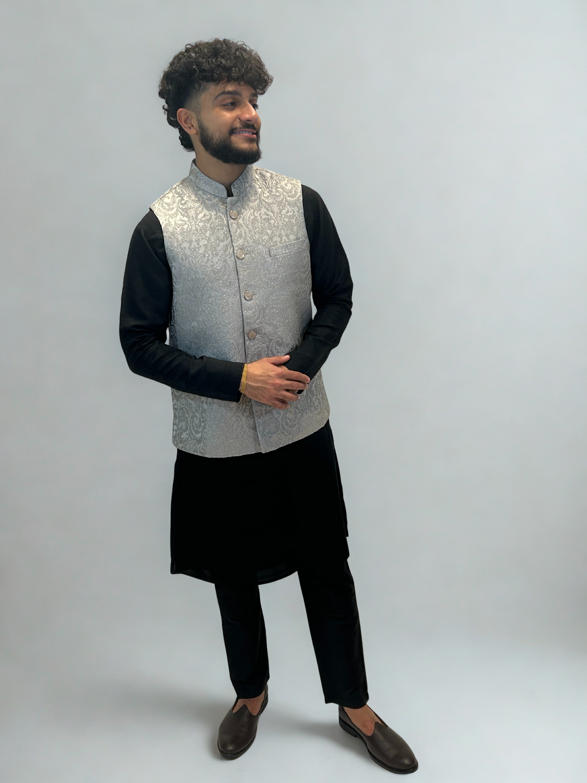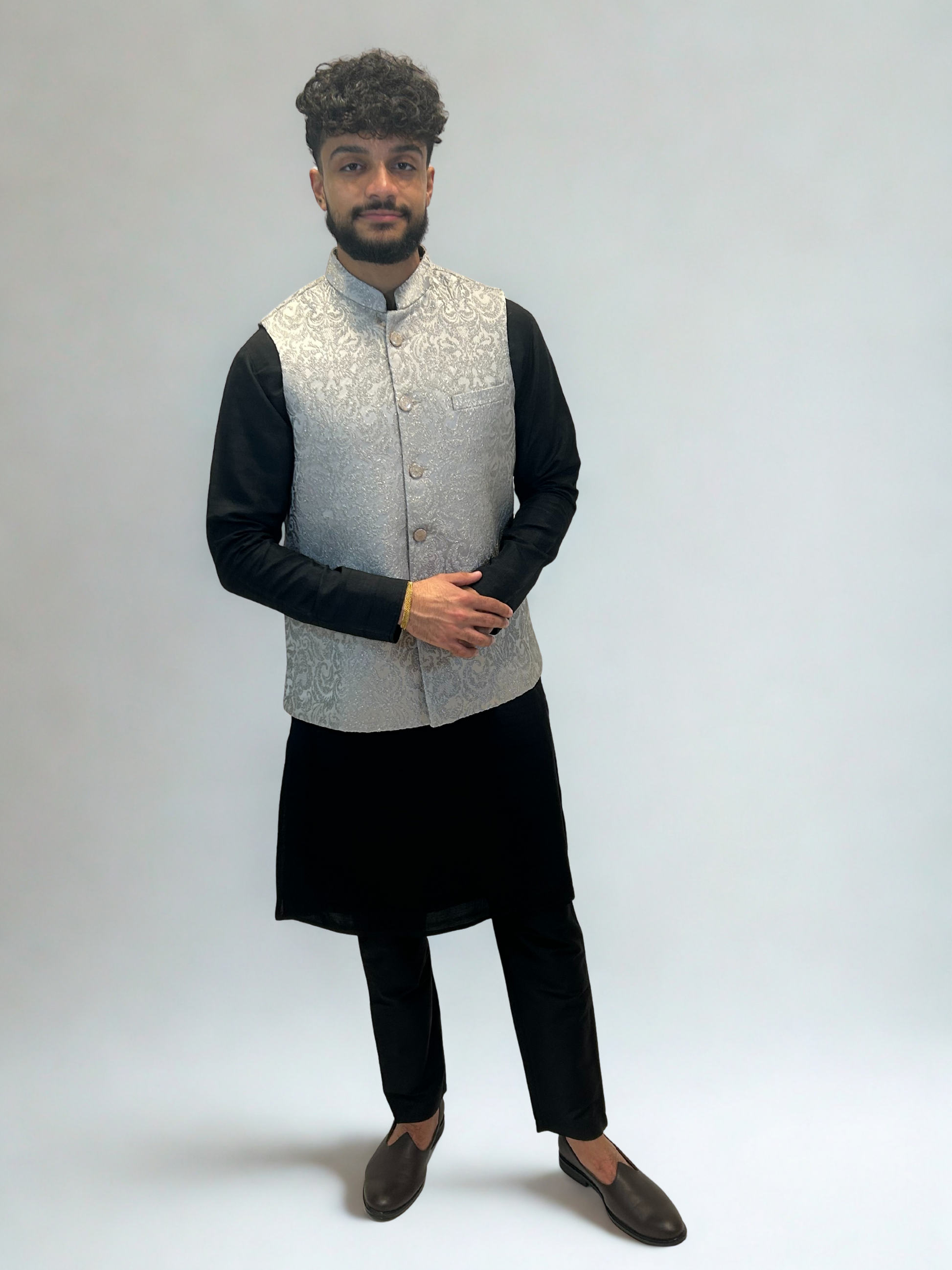 - Pair over a black kurta for contrast and a bold evening statement