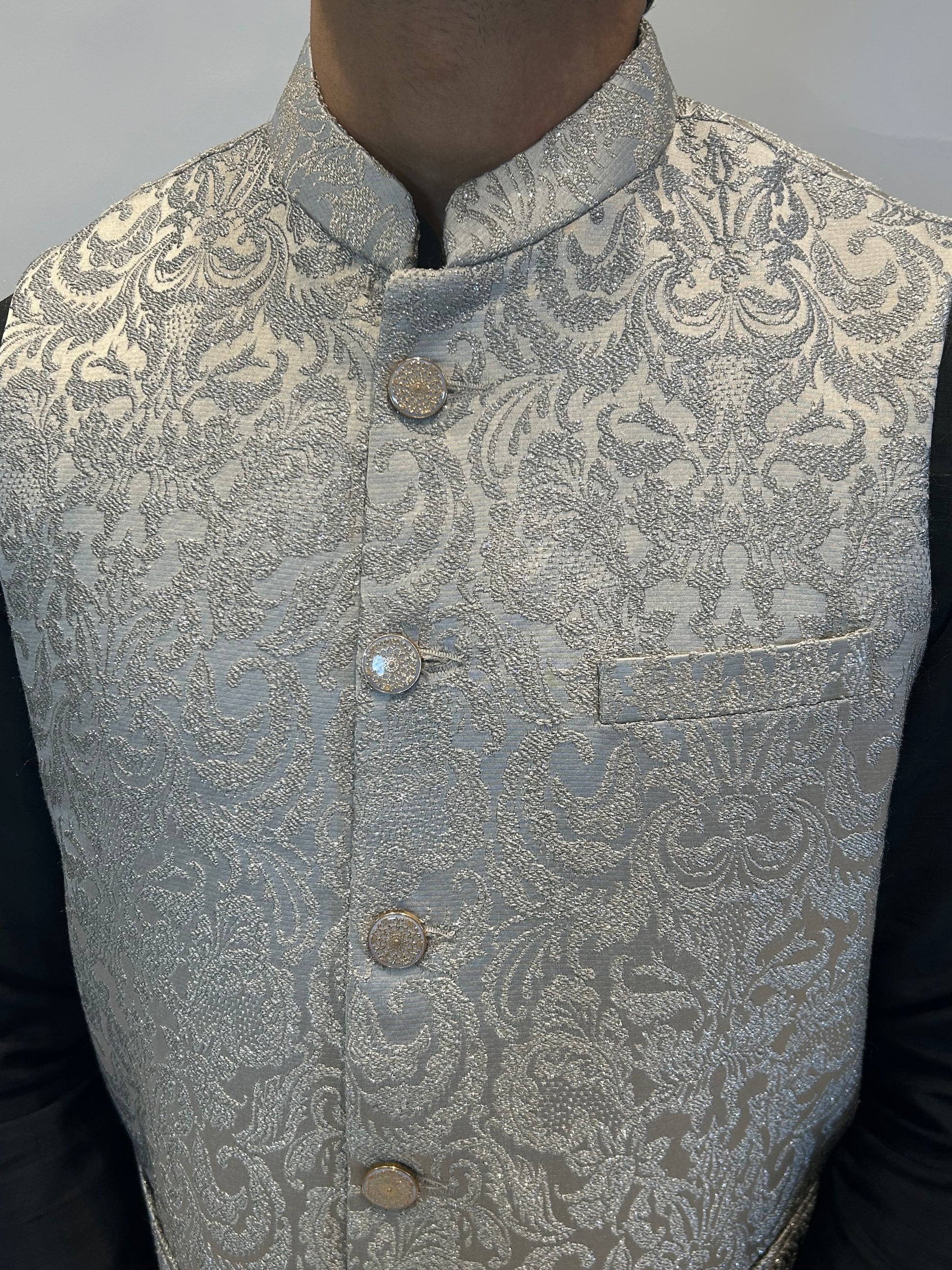 The Silver Textured Nehru Jacket embodies timeless sophistication with a sleek, modern finish. Crafted from a soft textured fabric, this jacket showcases an elegant woven pattern in metallic silver tones, complemented by detailed metallic buttons for a sharp, elevated look.