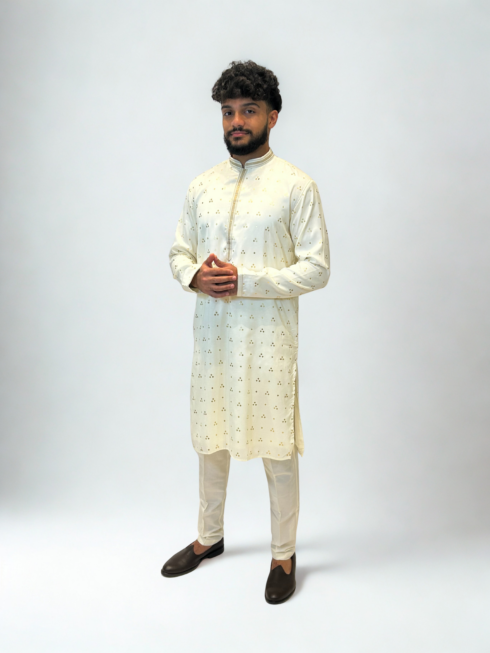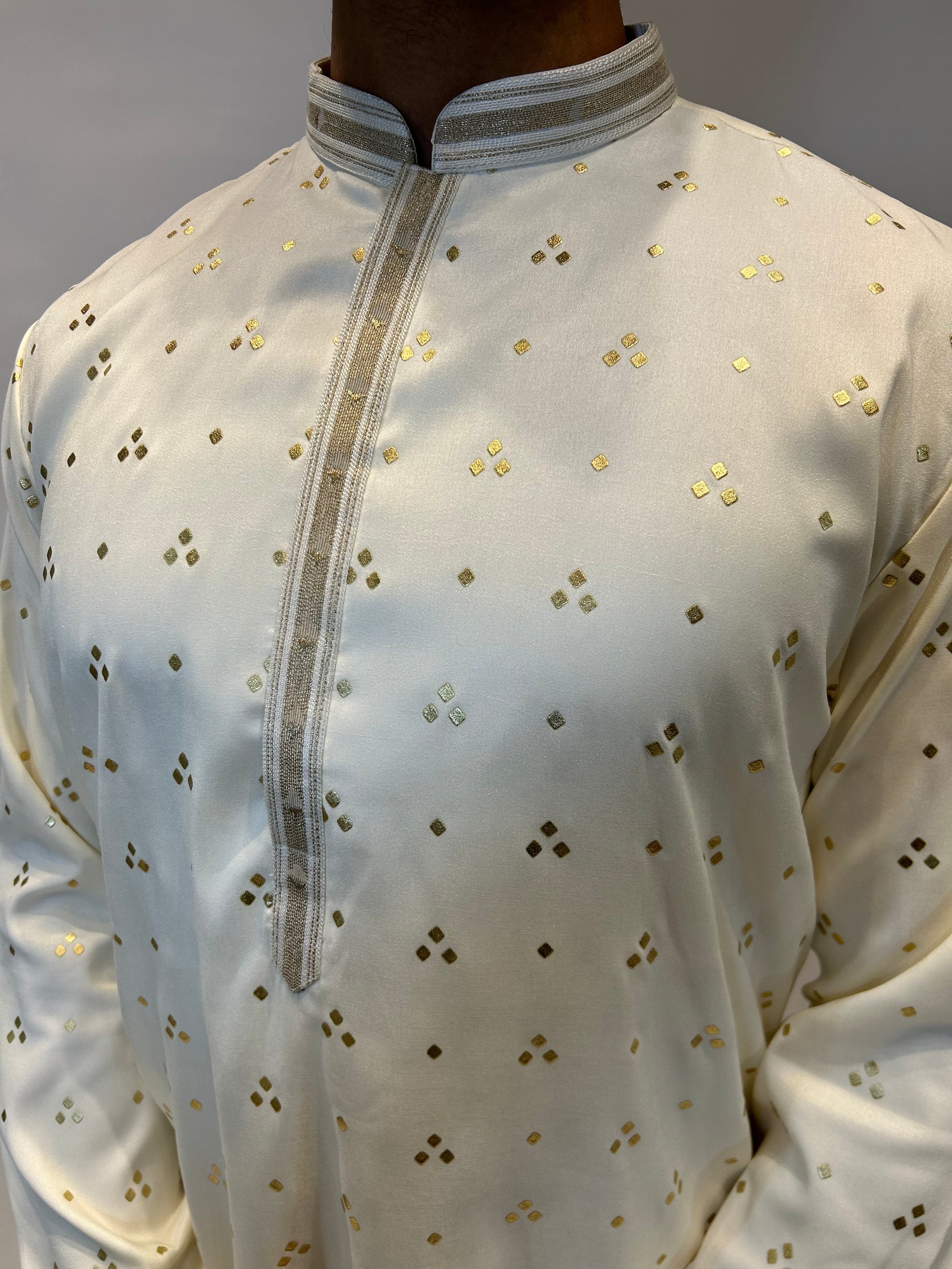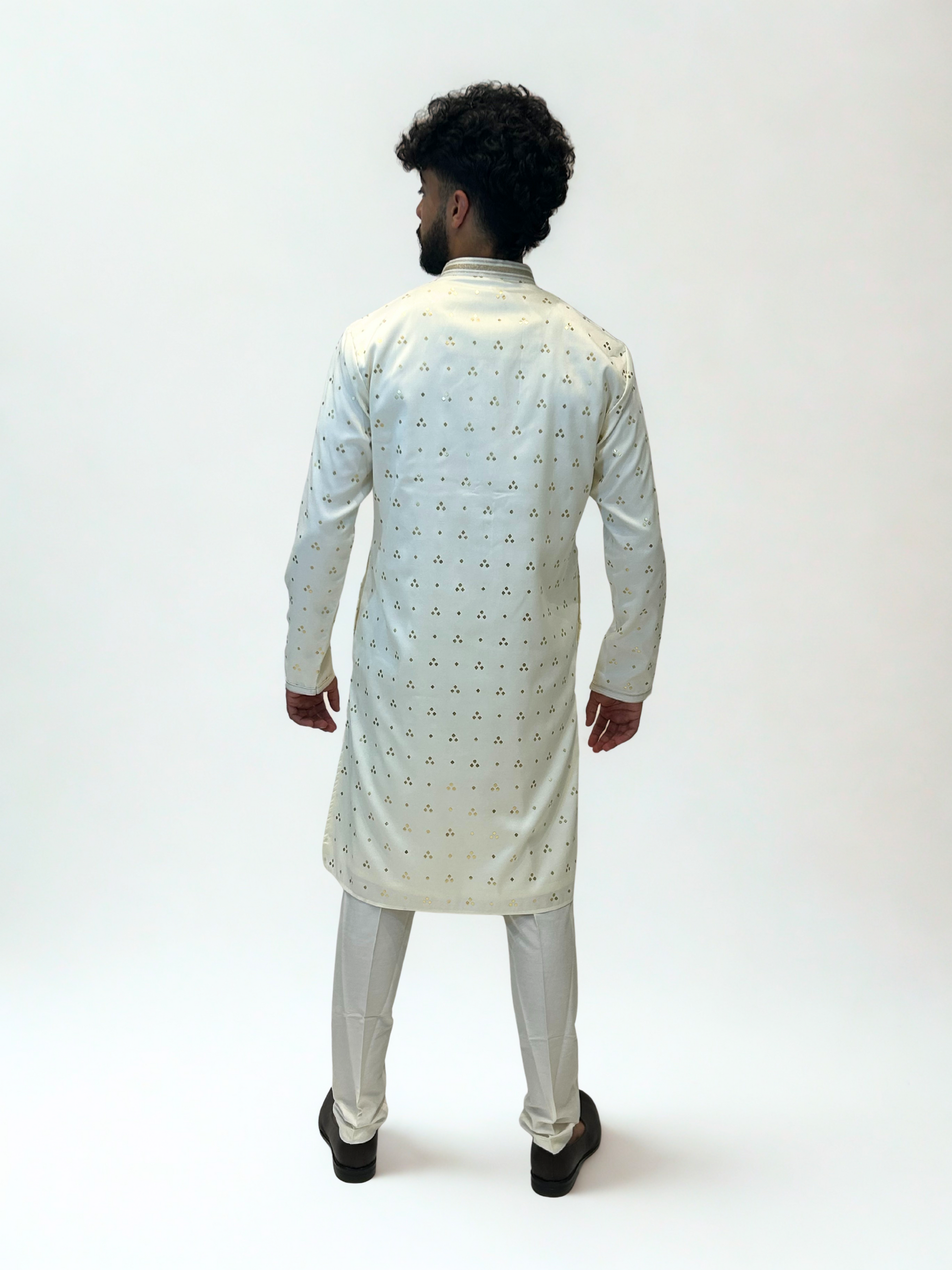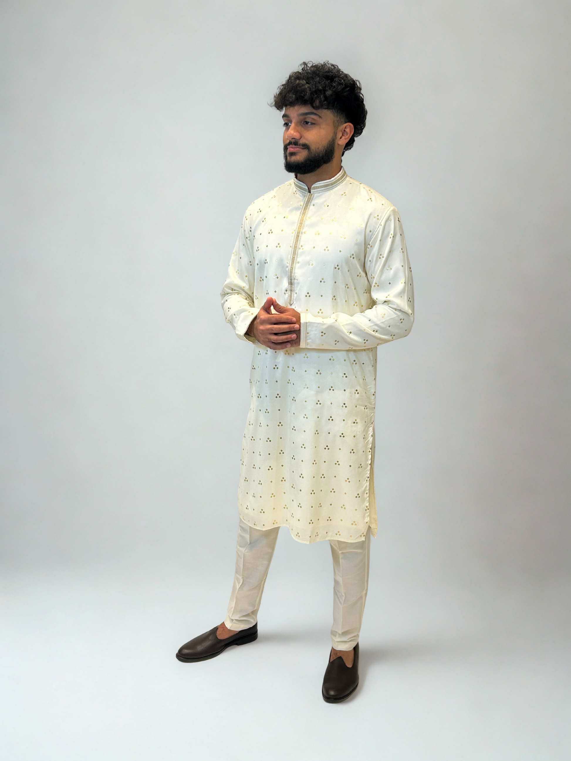 The Ivory Gold Foil Kurta Set radiates subtle opulence with its luminous ivory base and refined metallic detailing. Crafted in a smooth, polished fabric, the kurta features delicate gold foil motifs arranged in an elegant geometric rhythm — offering a timeless fusion of sophistication and modern simplicity.