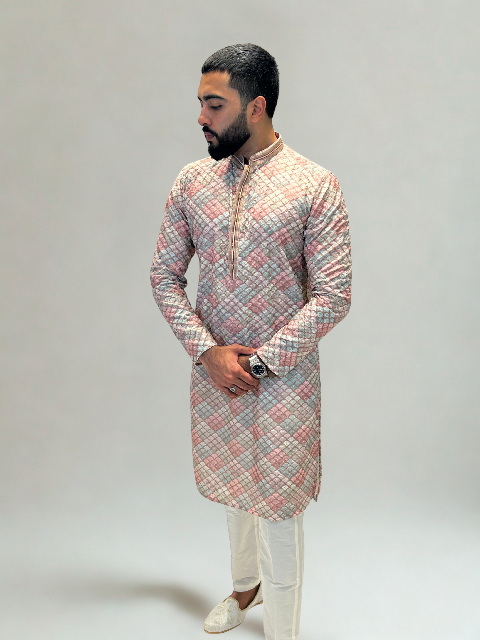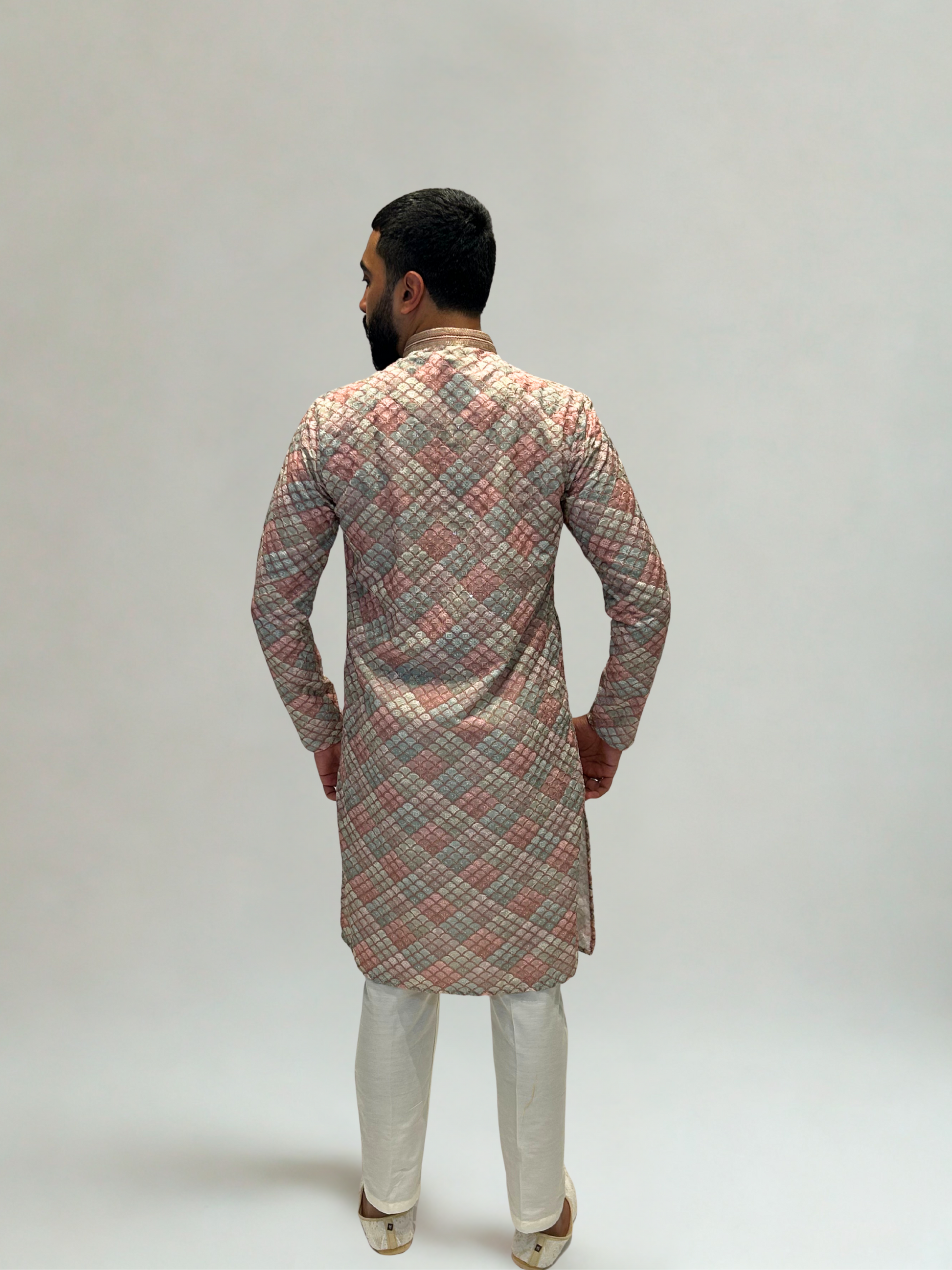 Understated yet detailed, our Pastel Mosaic Weave Kurta Set blends classic craftsmanship with a modern silhouette. The intricate diamond pattern in subtle shades of blush pink, mint, and ivory creates a luxurious texture that feels timeless yet refreshing.