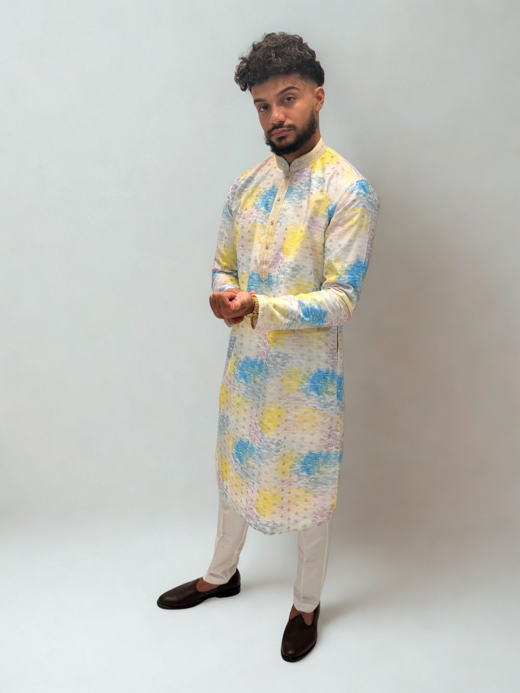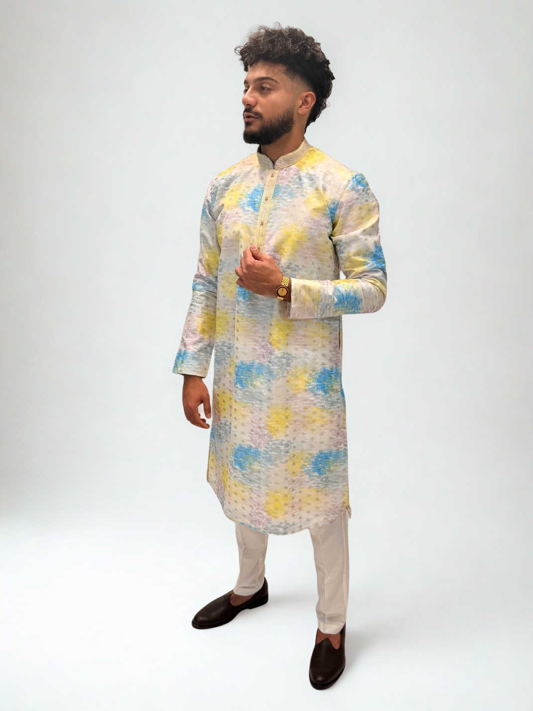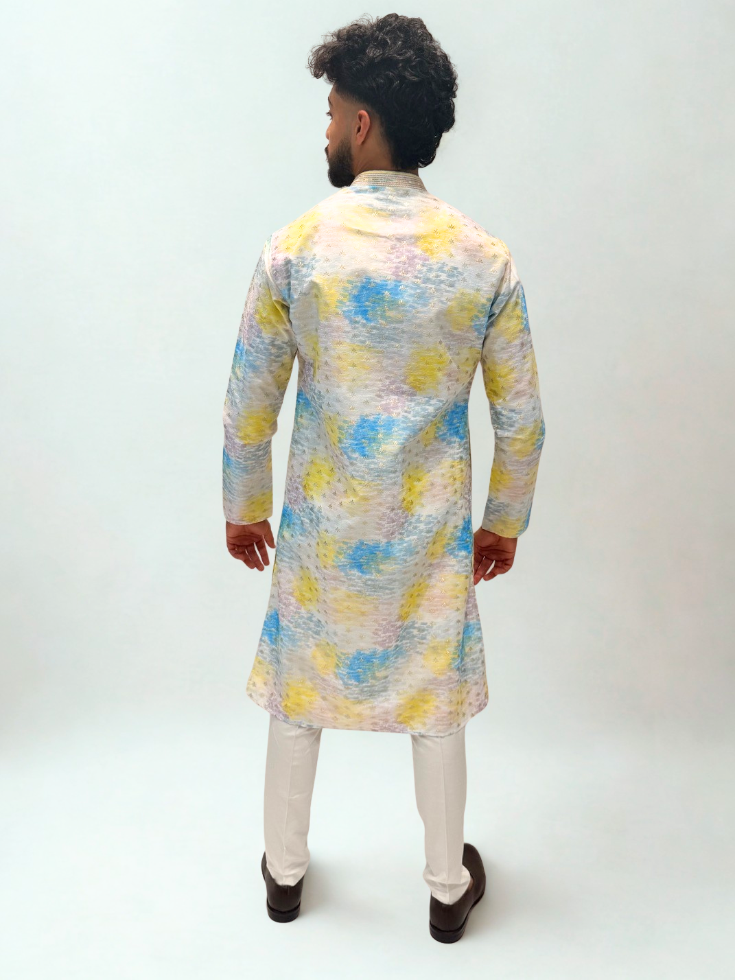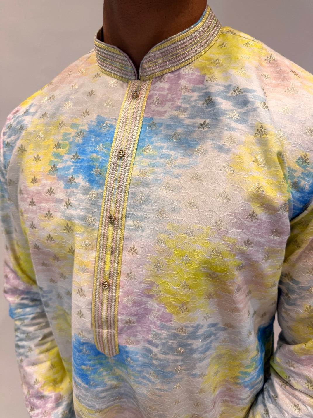 Soft, radiant, and full of charm — the Pastel Cloud Pattern Kurta Set captures a serene blend of hues that evoke freshness and festivity. Its watercolor-inspired tones and subtle gold motifs make it a standout piece for daytime events and elegant celebrations.