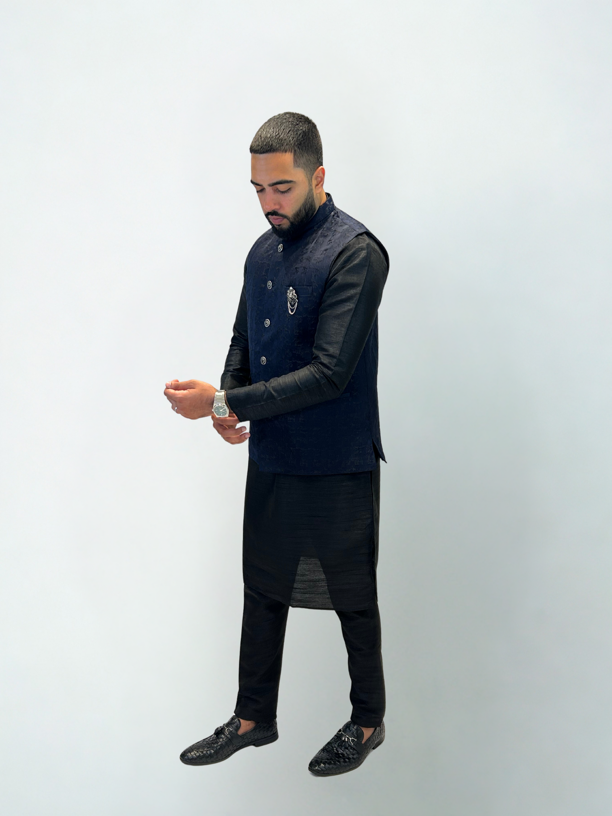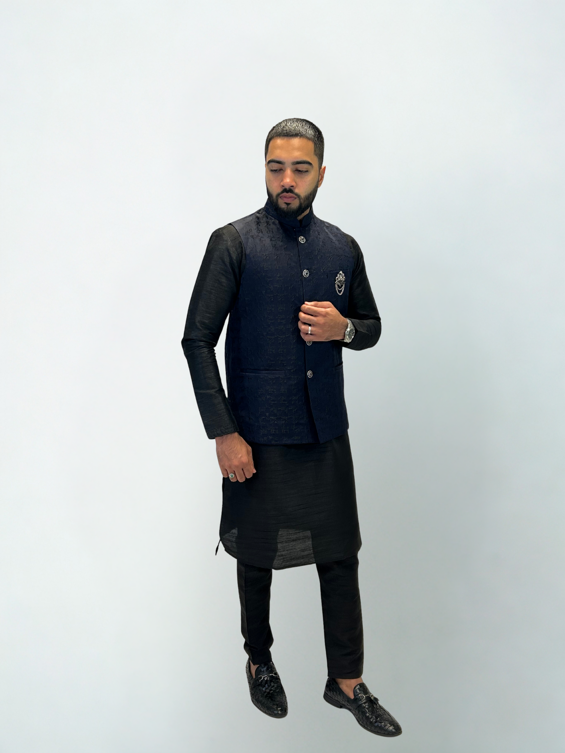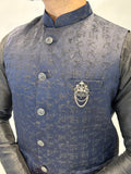 Refine your ethnic wardrobe with our Black & Navy Textured Nehru Jacket. Crafted in a rich jacquard finish, this jacket offers a sophisticated touch with its subtle woven texture and metallic buttons. The tailored silhouette and brooch detail make it a versatile piece for both festive and formal wear.