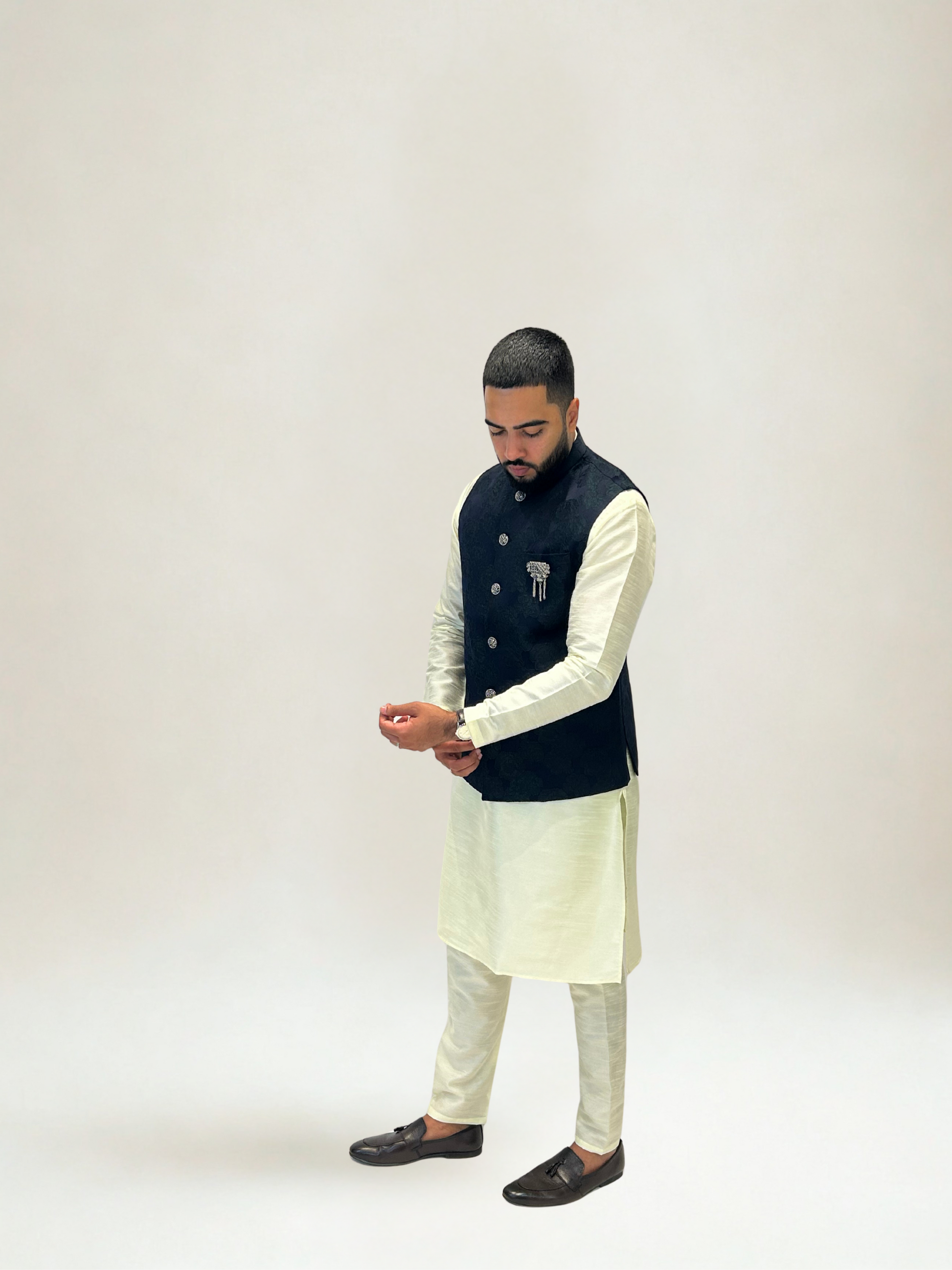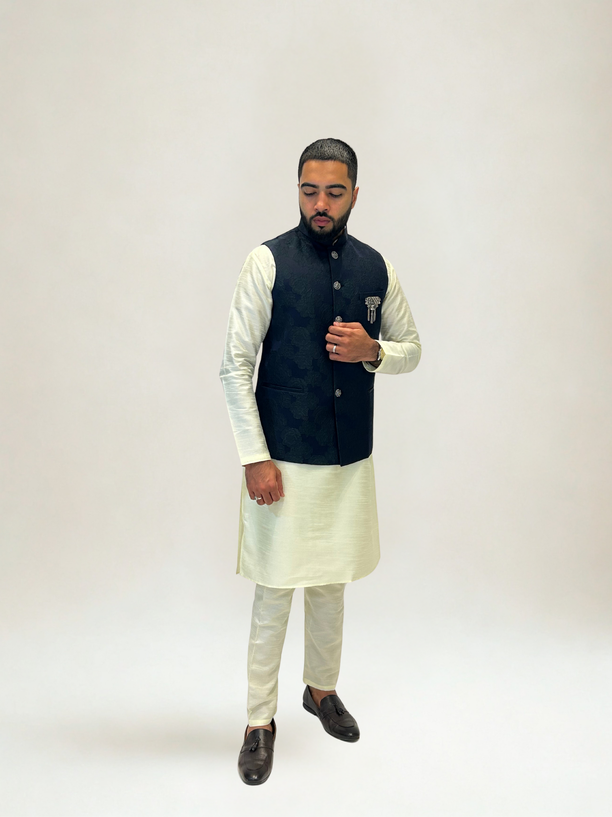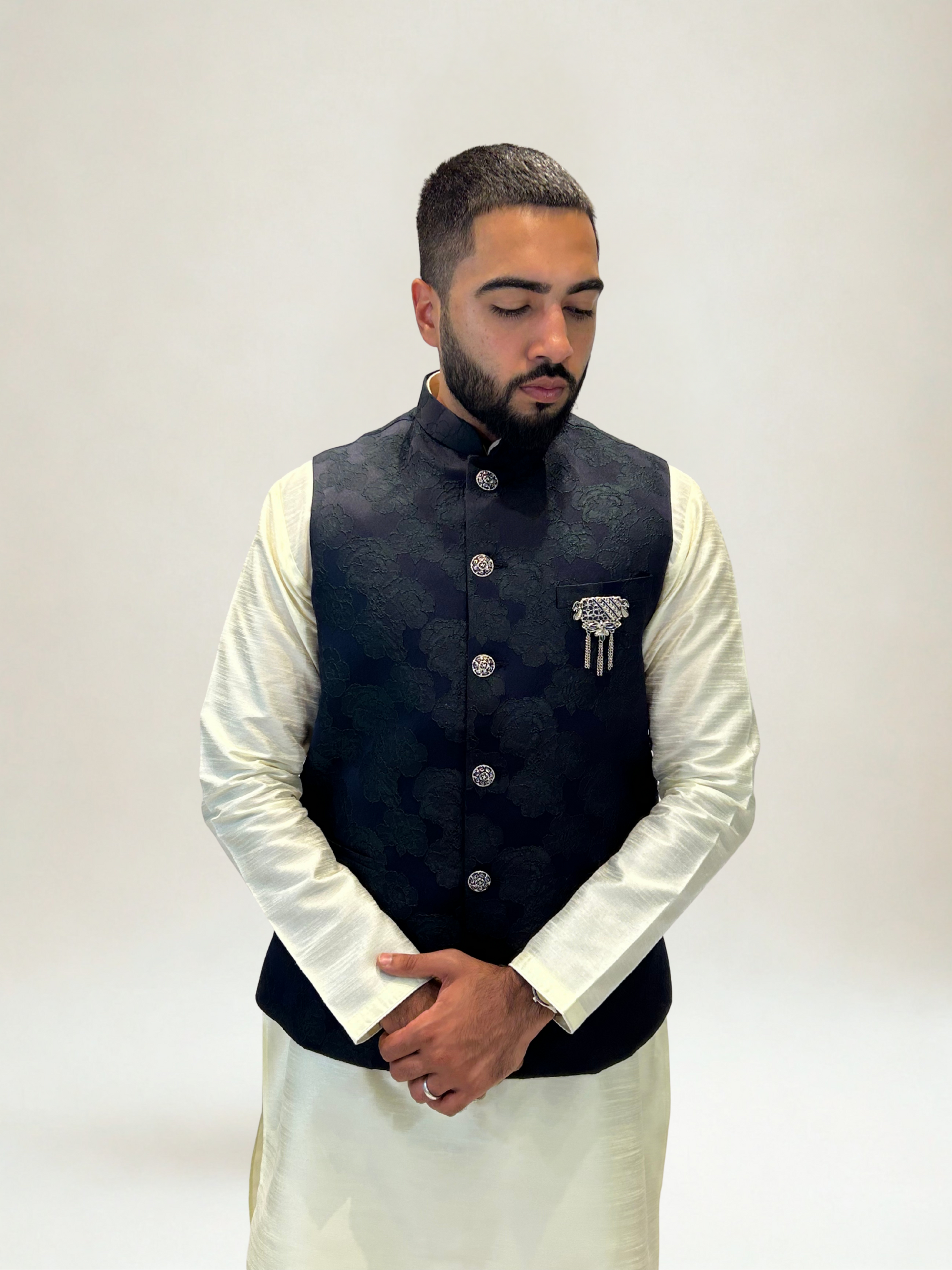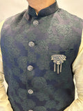 Pair with an ivory or beige kurta pajama for contrast, or layer over navy for a tonal look. Add polished loafers or mojaris to complete the outfit. The detachable brooch adds a touch of opulence—perfect for evening occasions.