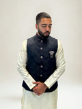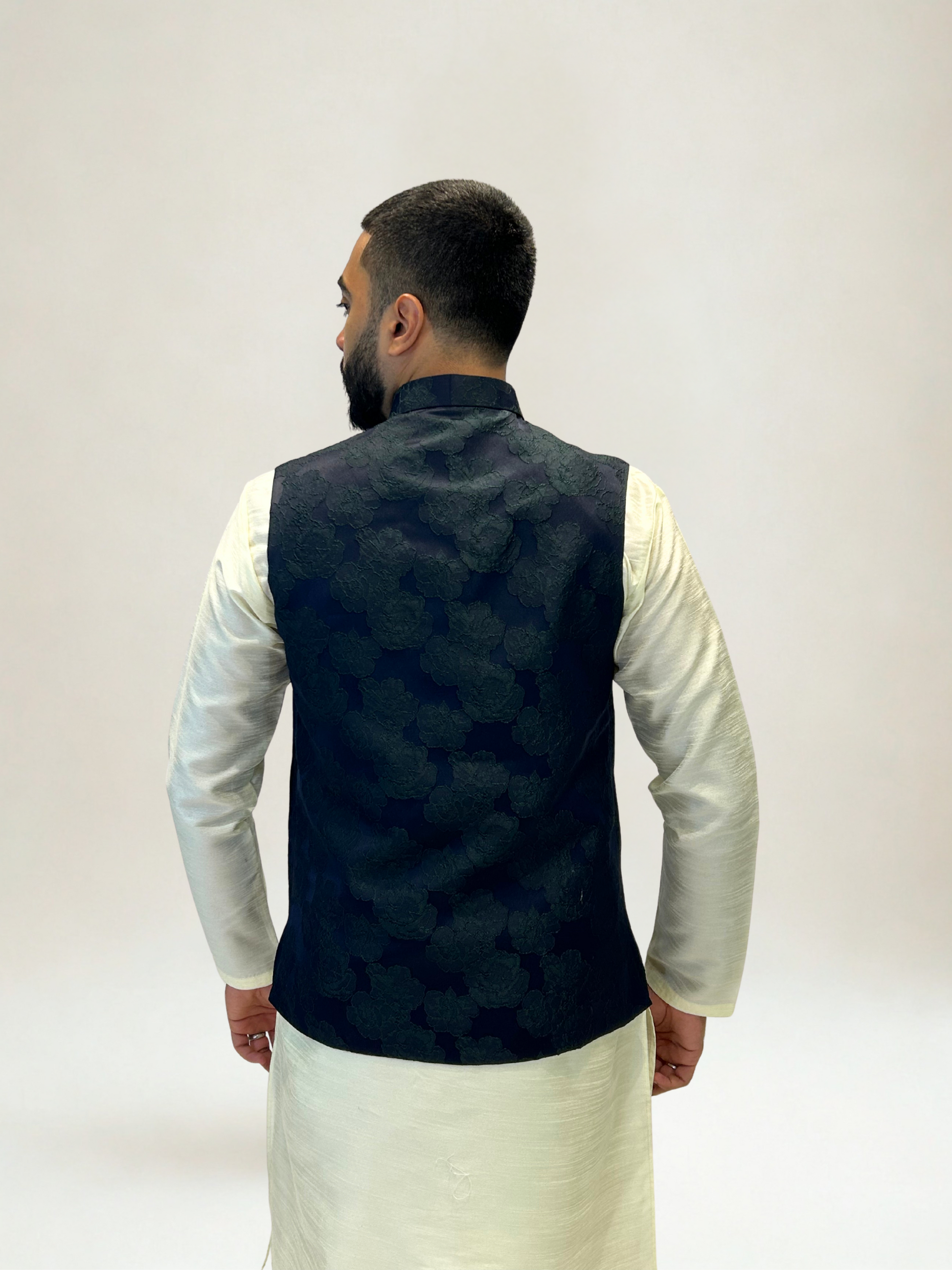 Designed for the modern gentleman, this Nehru jacket blends understated floral detail with bold navy sophistication, making it a versatile statement piece.