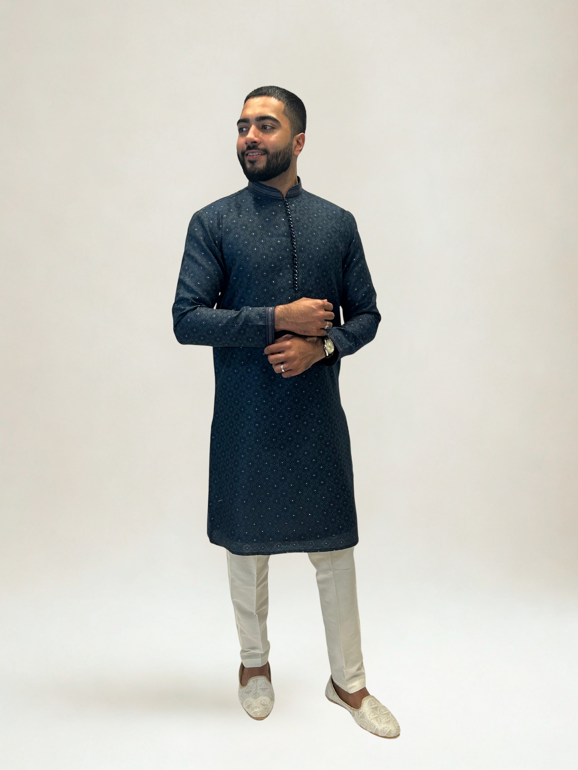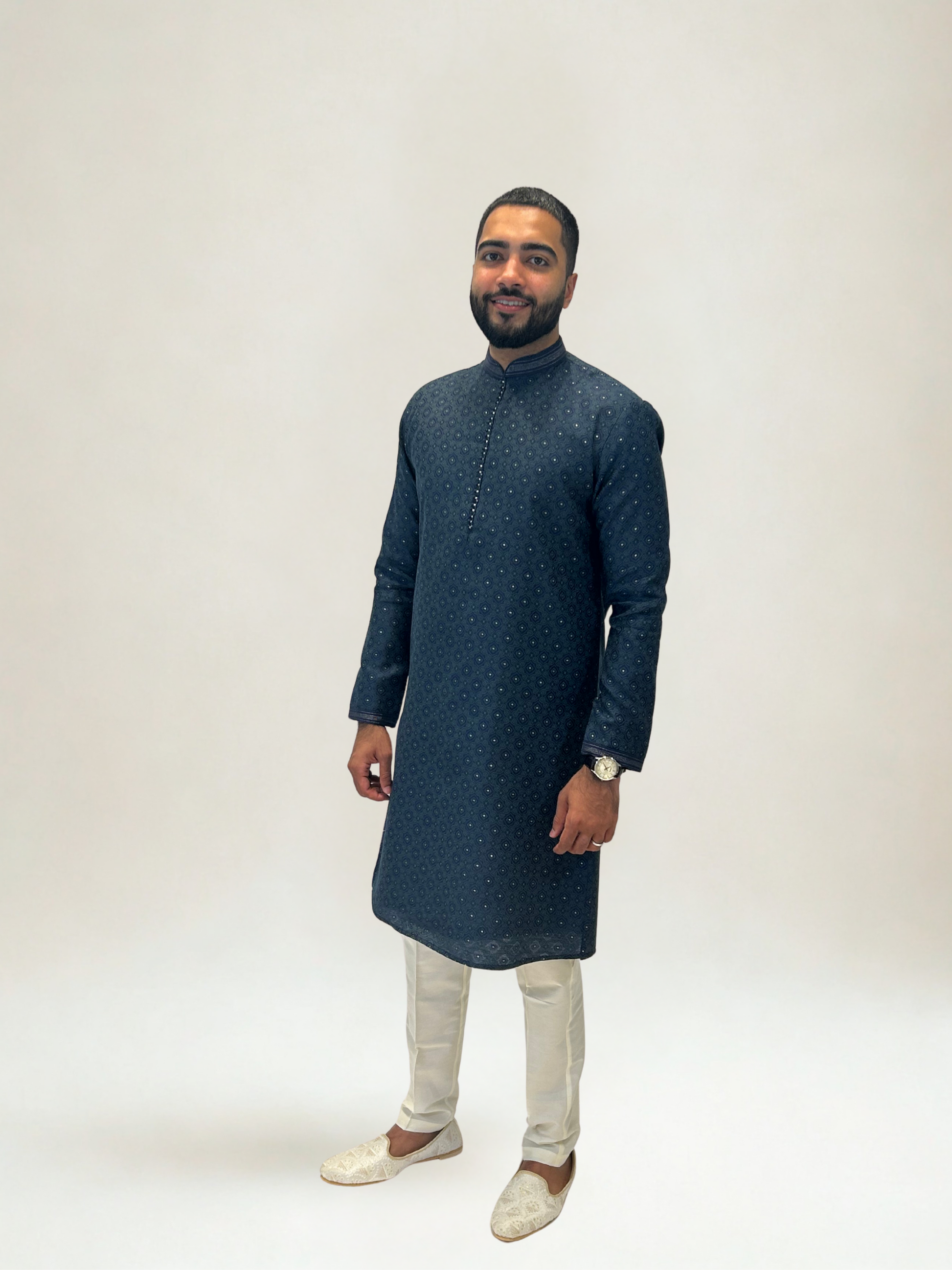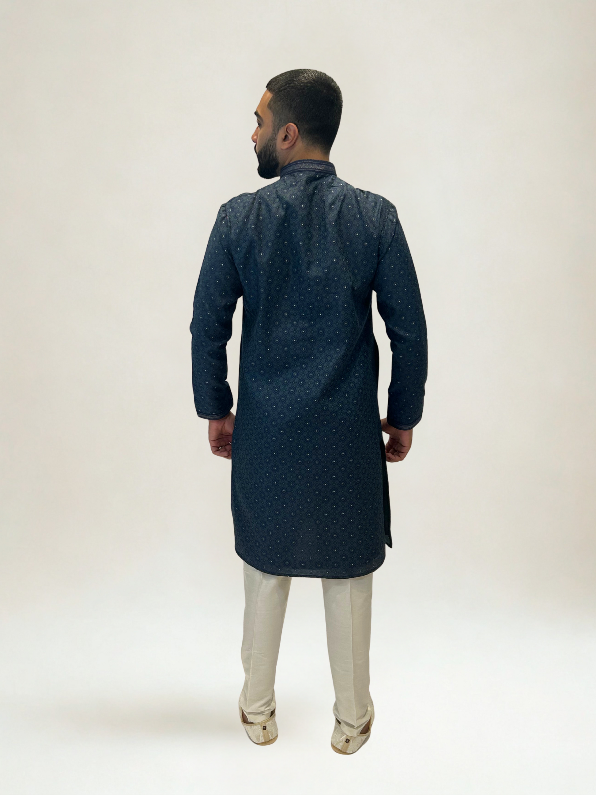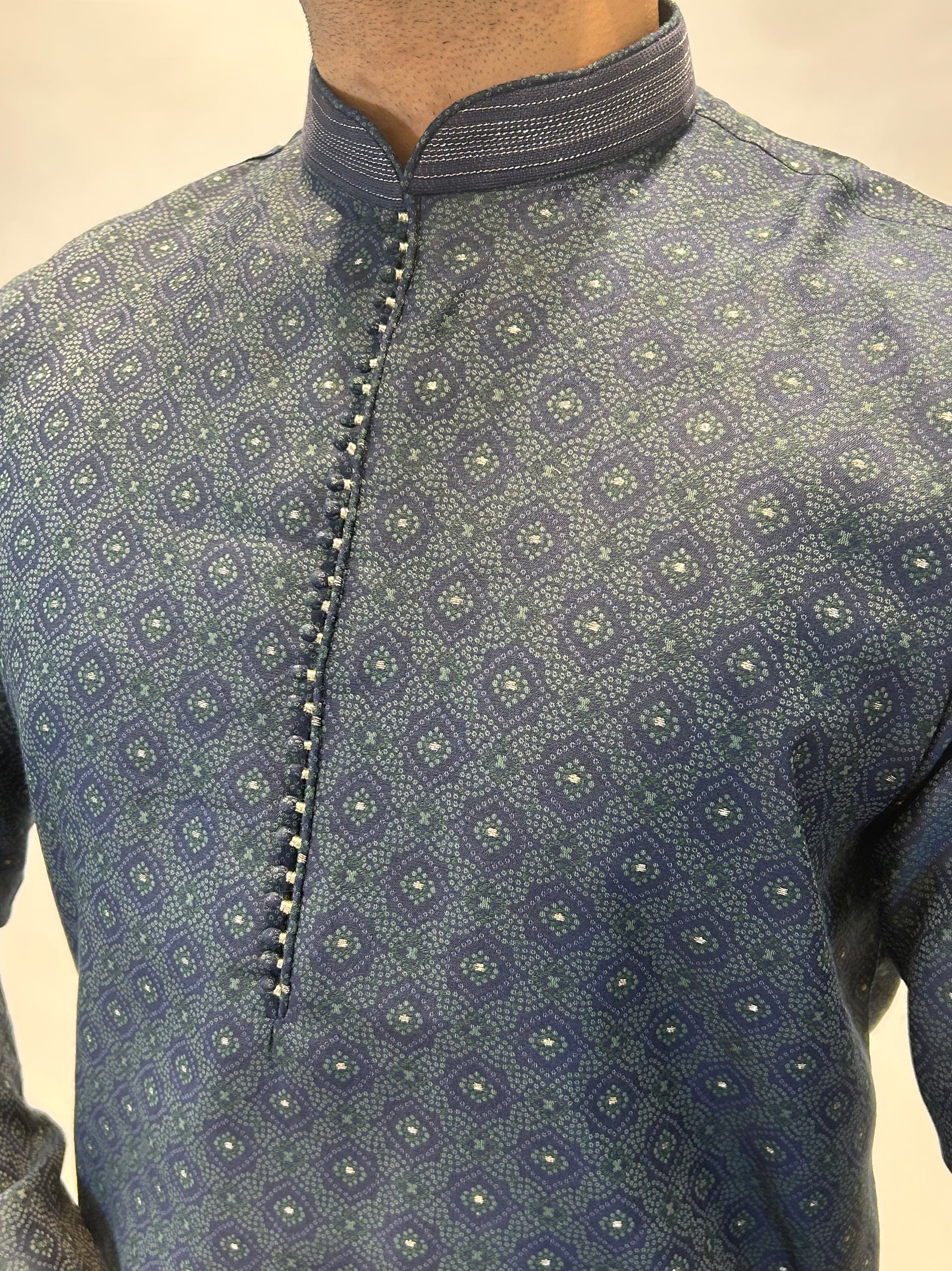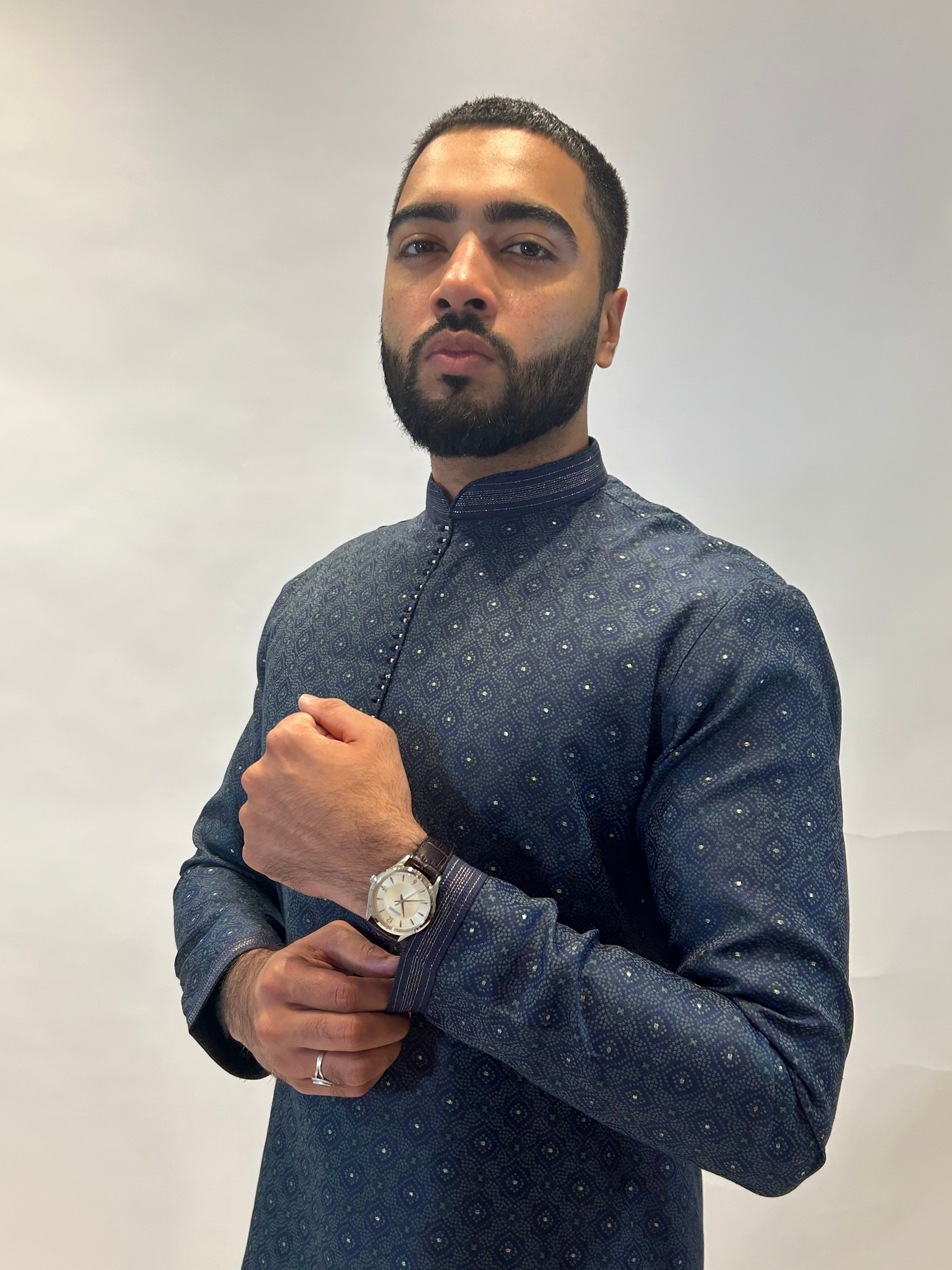 Regal and refined, this Navy & Green Patterned Kurta Set is a celebration of tradition reimagined through modern tailoring. Hints of antique gold are intricately woven into the geometric pattern, creating depth and dimension on a navy blue canvas. A confident choice for evening events and festive affairs alike.
