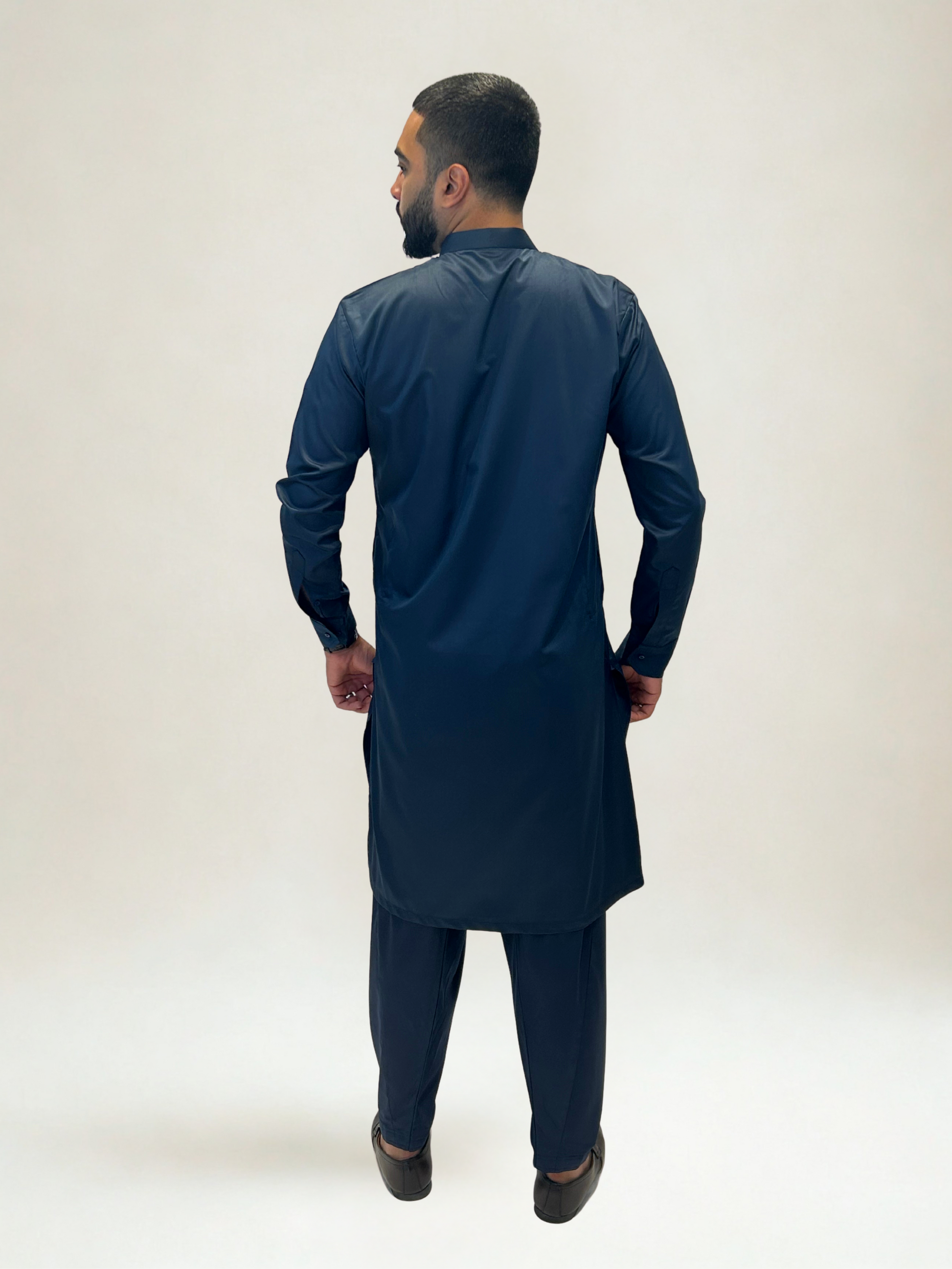 With its bold navy color and clean tailoring, this kurta shalwar set is a versatile staple for every refined wardrobe.