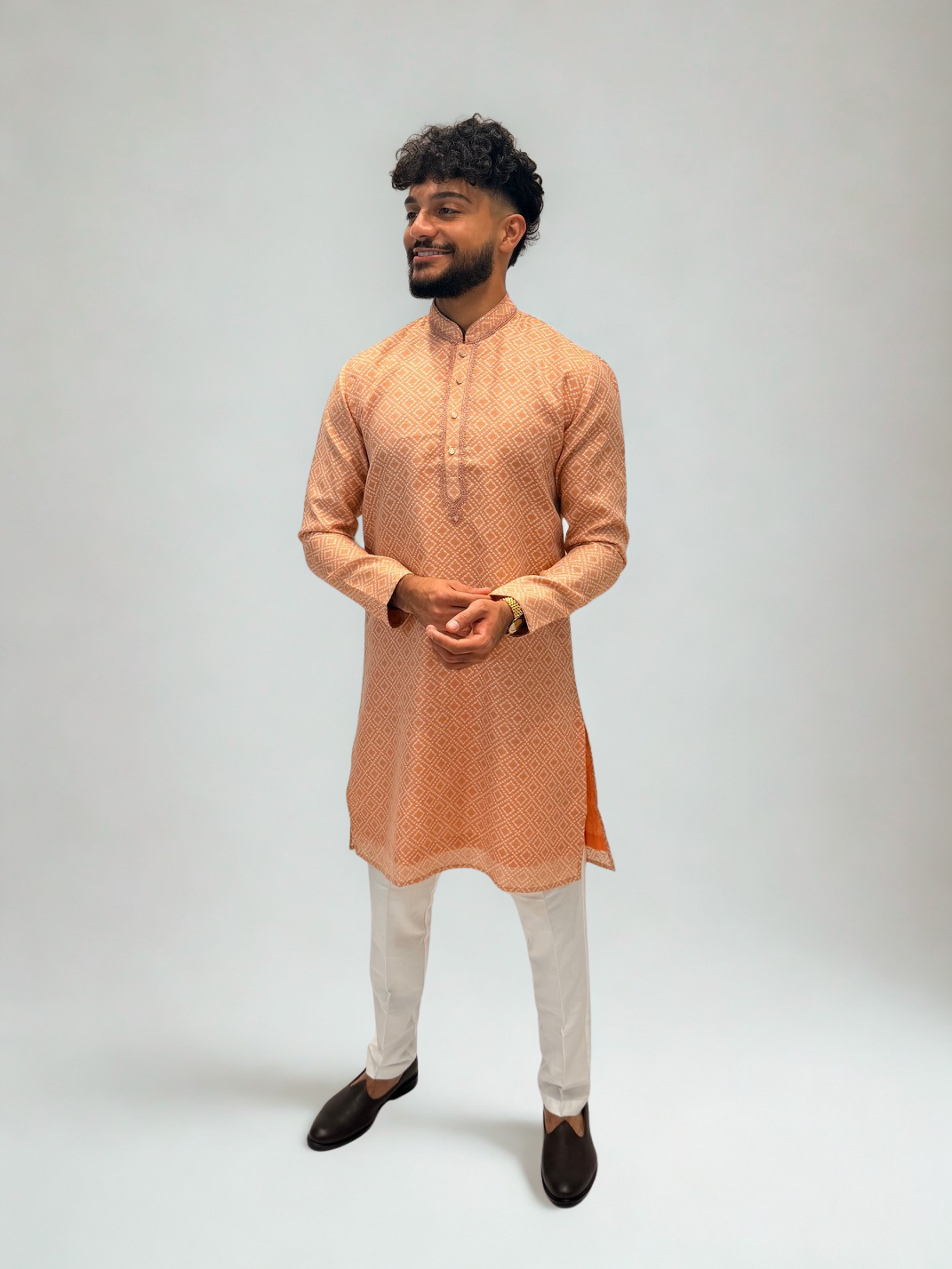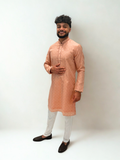 The Orange Peach Embroidered Kurta Set blends warmth and vibrance in a beautifully balanced hue, perfect for festive and daytime celebrations. Detailed with geometric weaving and soft lace embroidery, this kurta captures refined craftsmanship with a modern festive charm.