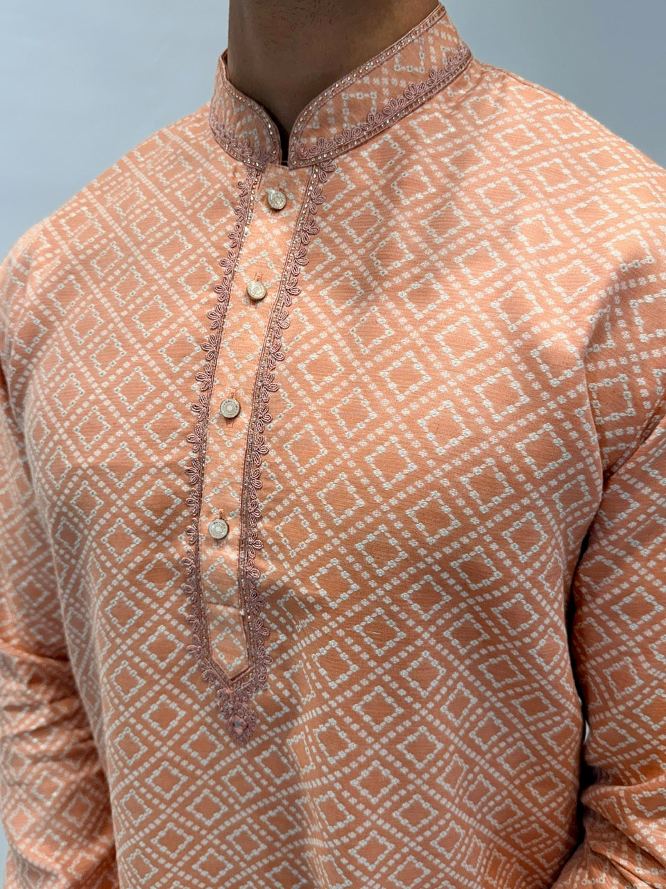 The kurta should fall comfortably around the chest and shoulders with enough room for easy movement. Pajamas are designed to taper towards the ankle for a clean and polished silhouette.