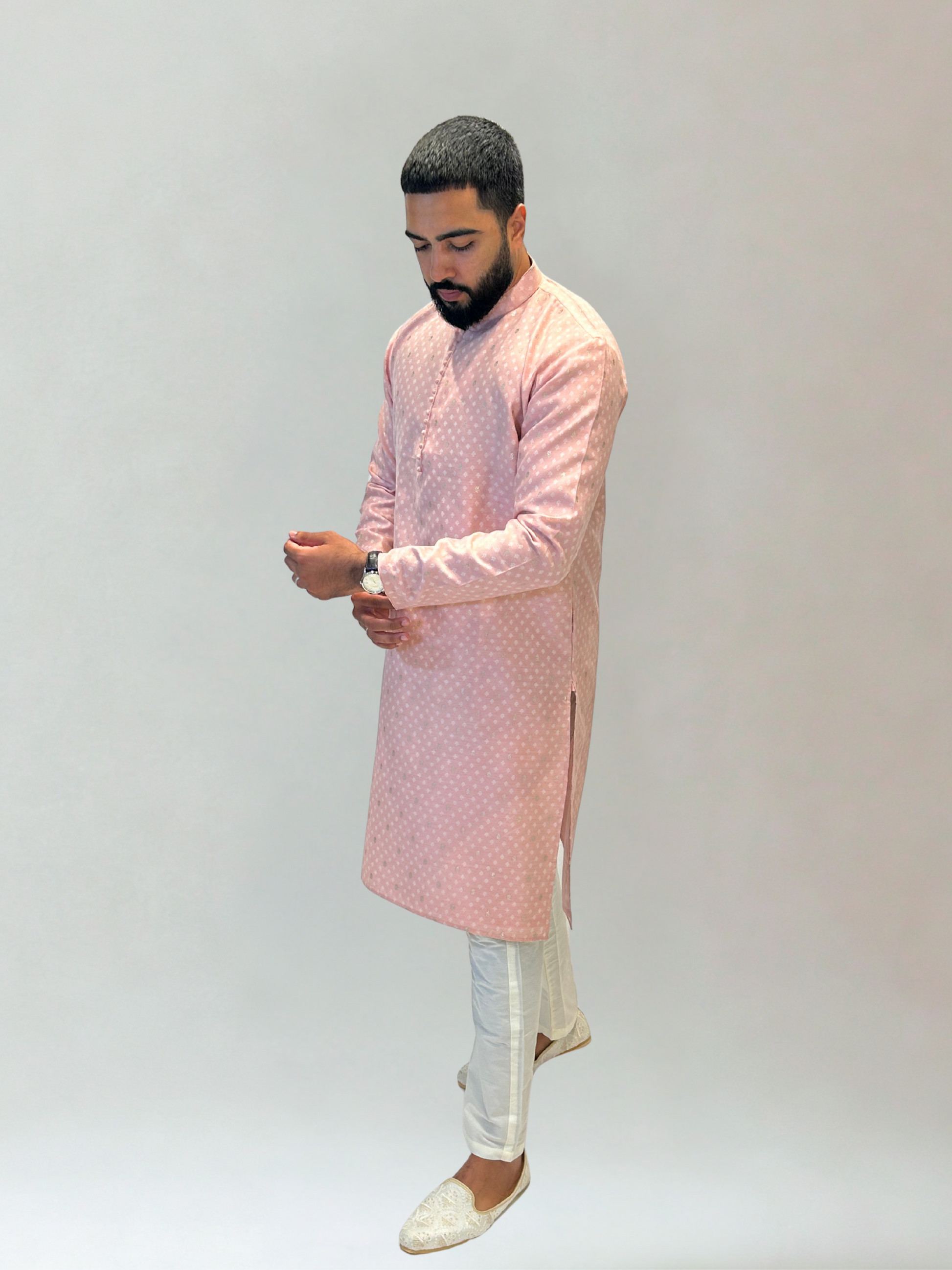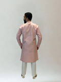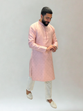 Subtle and sophisticated, our Pink Self Patterned Kurta Pajama Set features an elegant pastel pink tone with delicate self-woven patterns. The understated detailing creates a refined texture, making it a versatile choice for both festive and formal occasions.