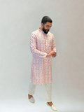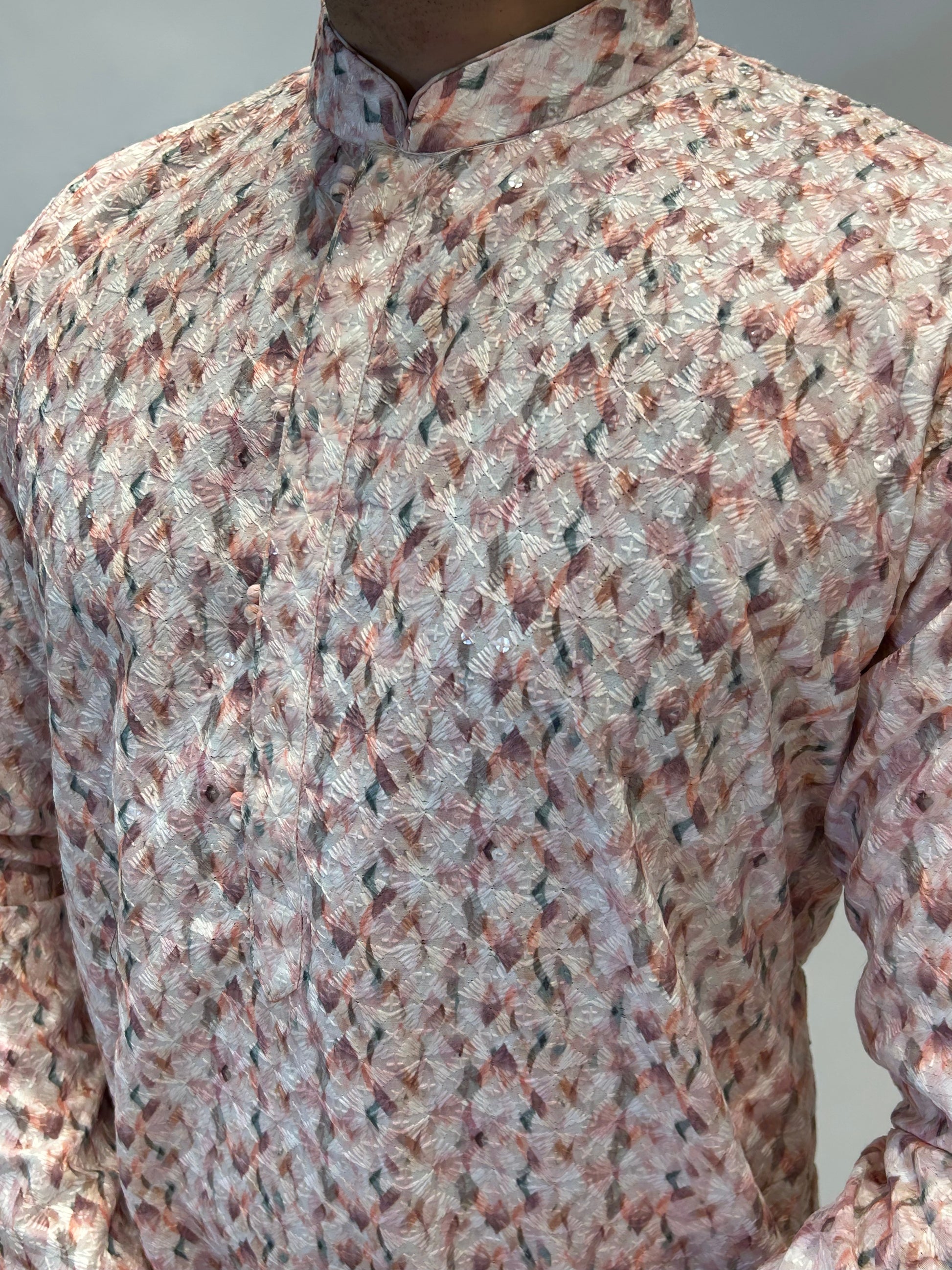 Pair with ivory or tan juttis for a classic festive style. For weddings or cultural celebrations, layer with a neutral waistcoat to complement the kurta’s pastel tones.