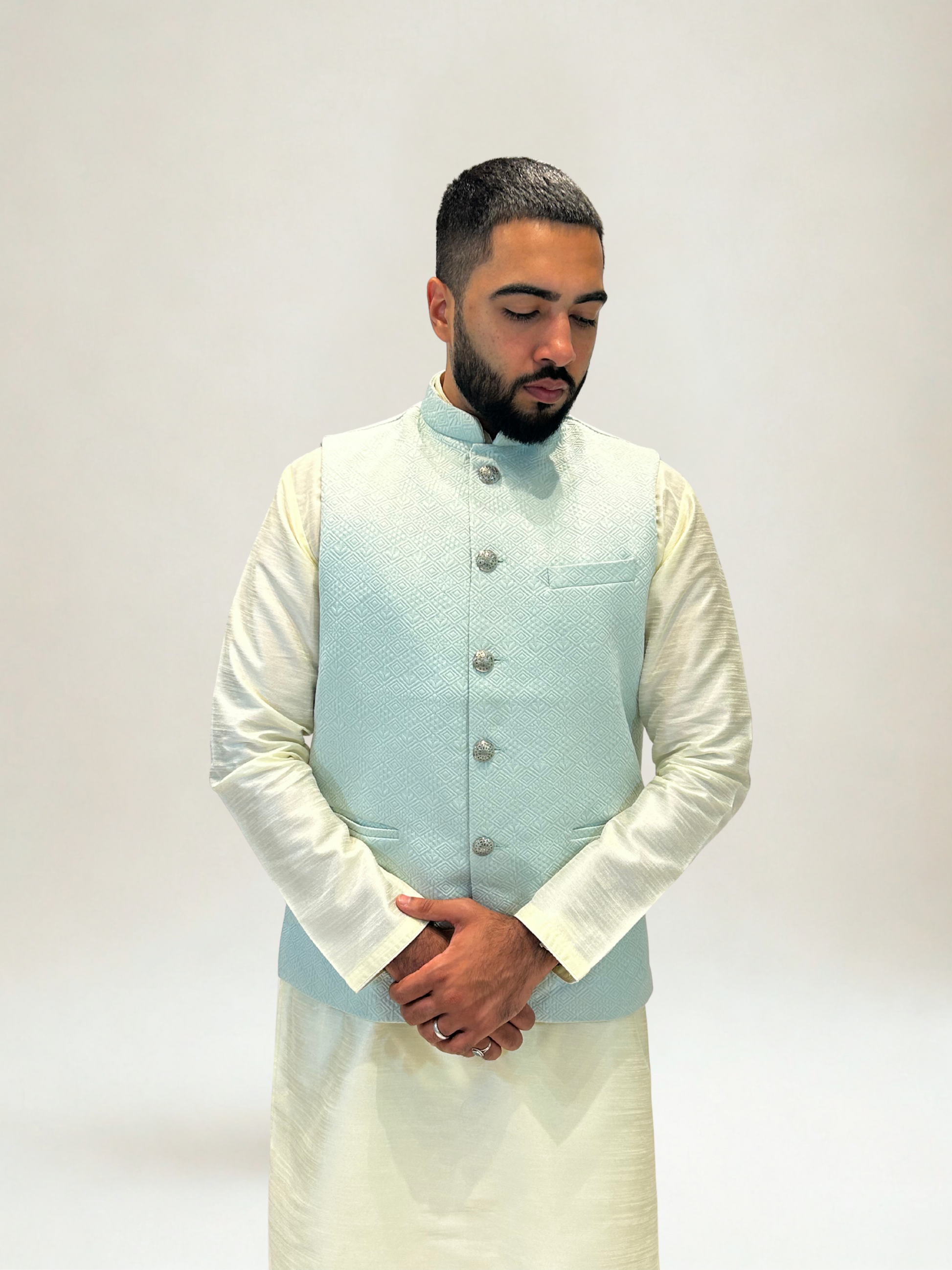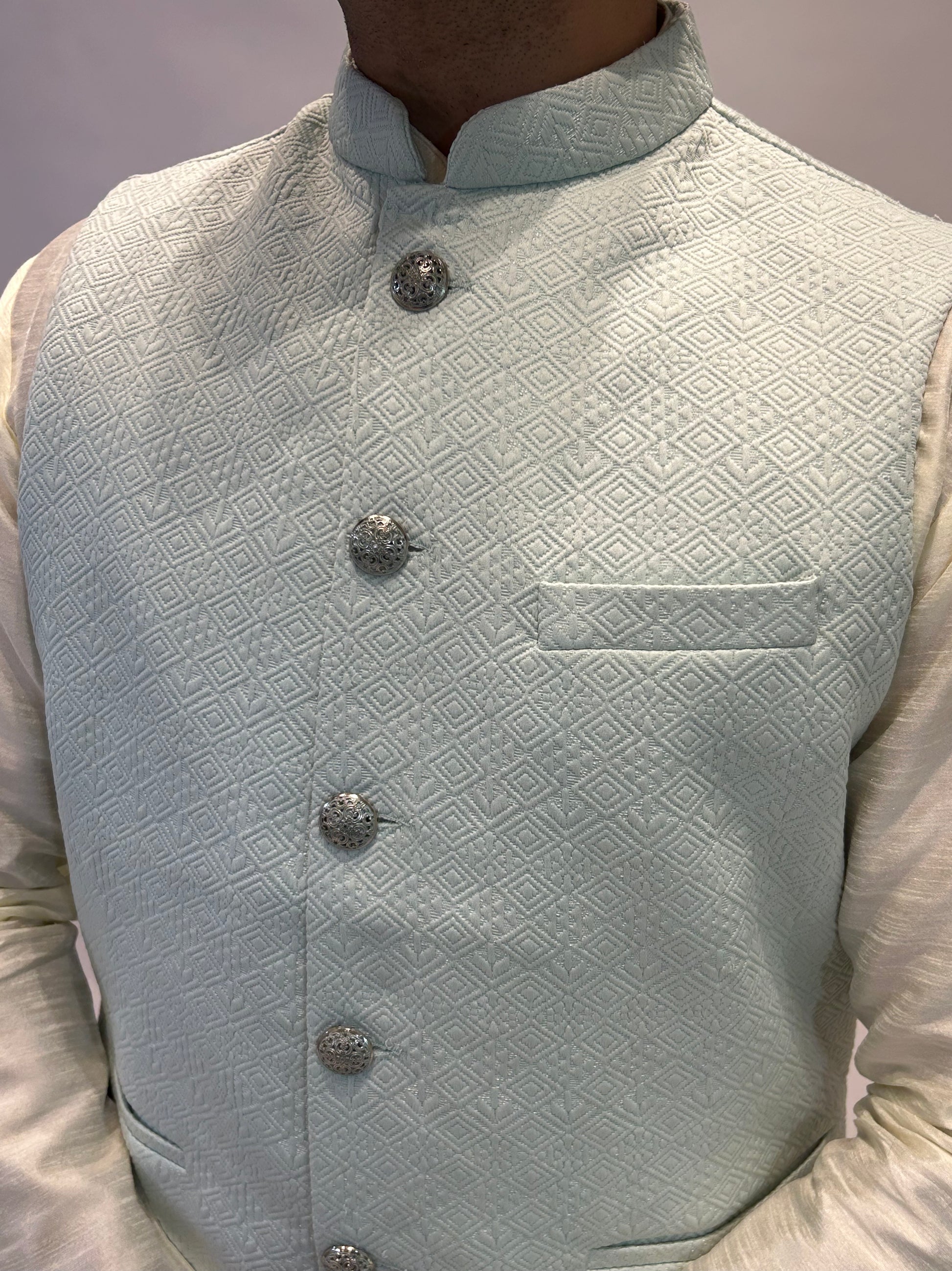 Refine your ethnic wardrobe with our Mint Green Self-Patterned Nehru Jacket. Crafted in a refreshing mint green hue with an all-over woven design, this jacket offers timeless sophistication. The tailored cut, band collar, and metallic statement buttons make it a versatile layer for both festive and formal occasions.