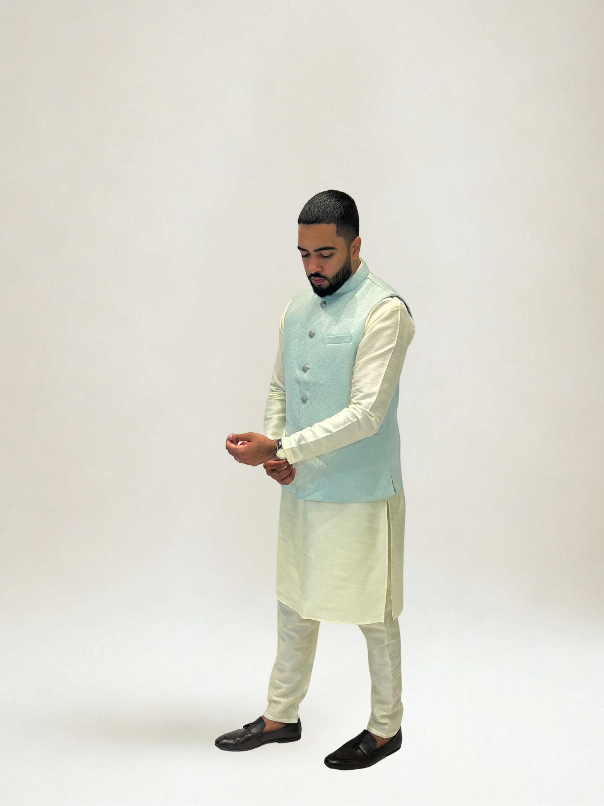 The jacket should fit snugly around the shoulders and chest, with the front closure sitting flat. Ensure the length aligns well with the kurta for a balanced, structured appearance.
