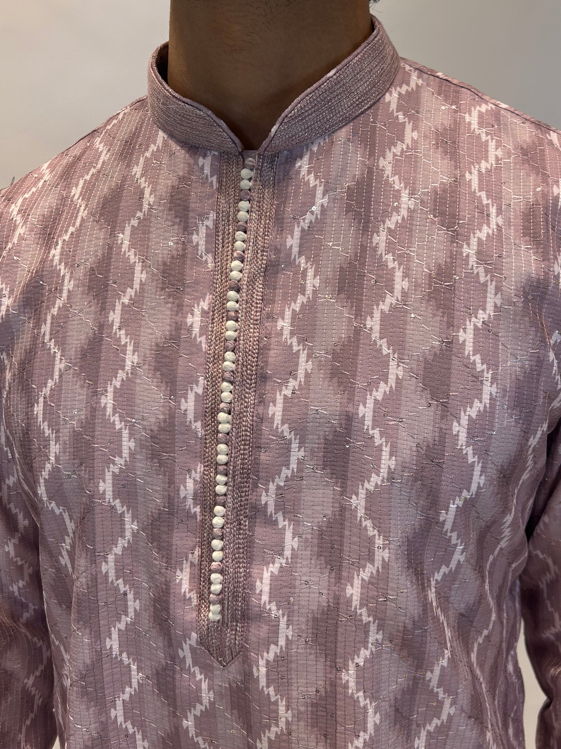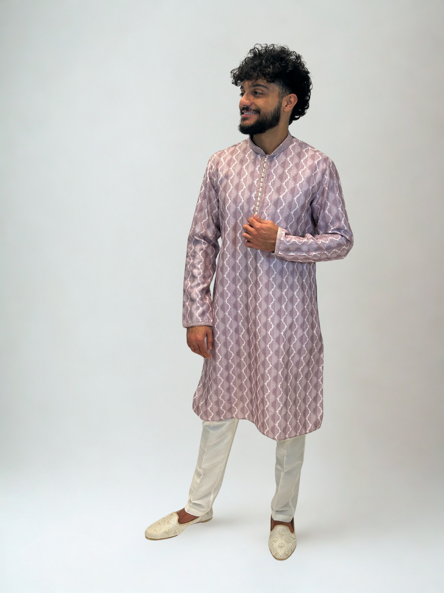 The Mauve Geometric Pattern Kurta Set brings a refined edge to contemporary ethnic wear. Crafted in a soft mauve hue, this kurta showcases a subtle geometric weave enhanced with self-thread detailing, offering a perfect blend of modern pattern work and timeless Indian elegance.