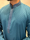 Teal Thread Self-Jaal Patterned Kurta Set