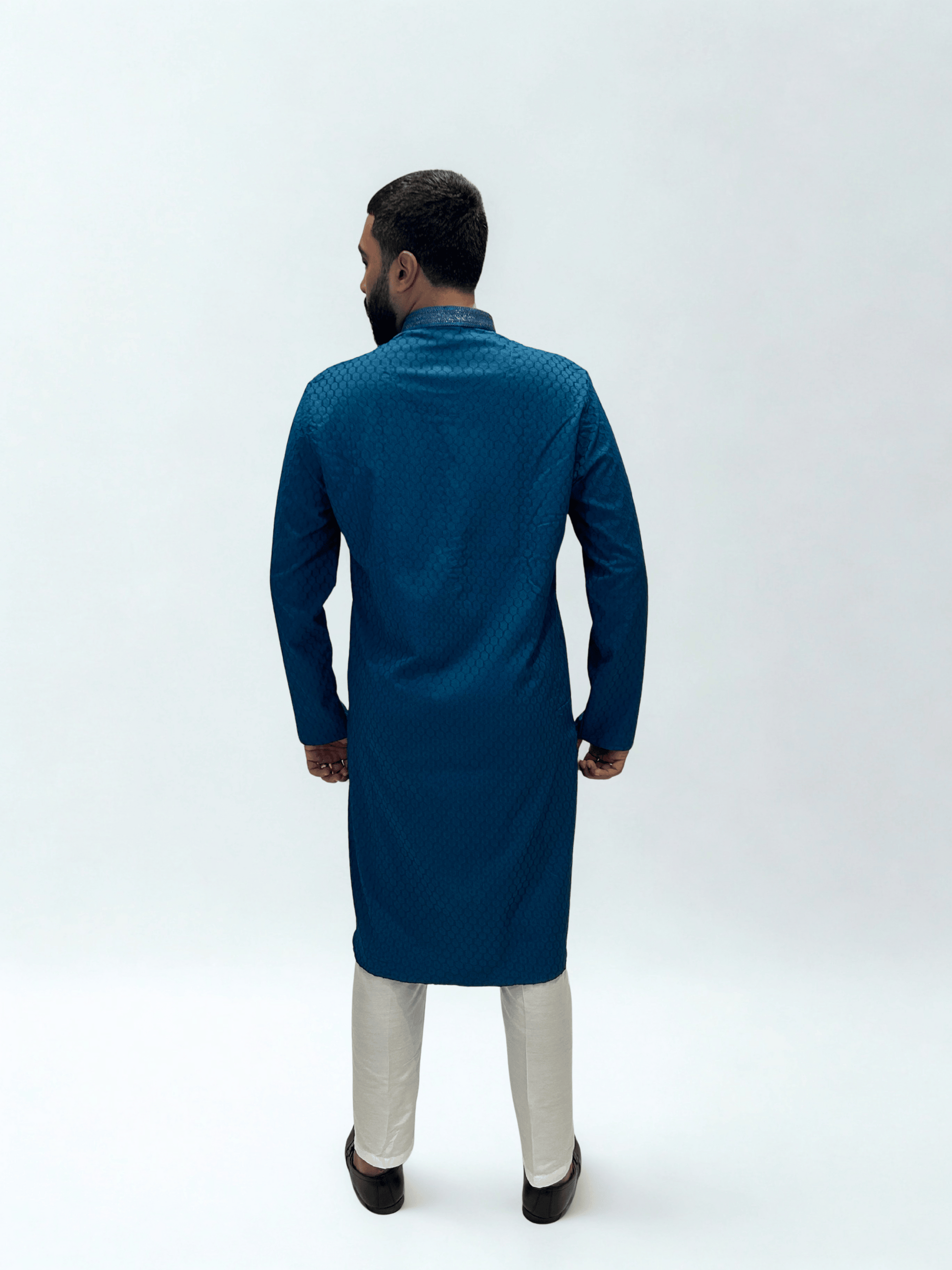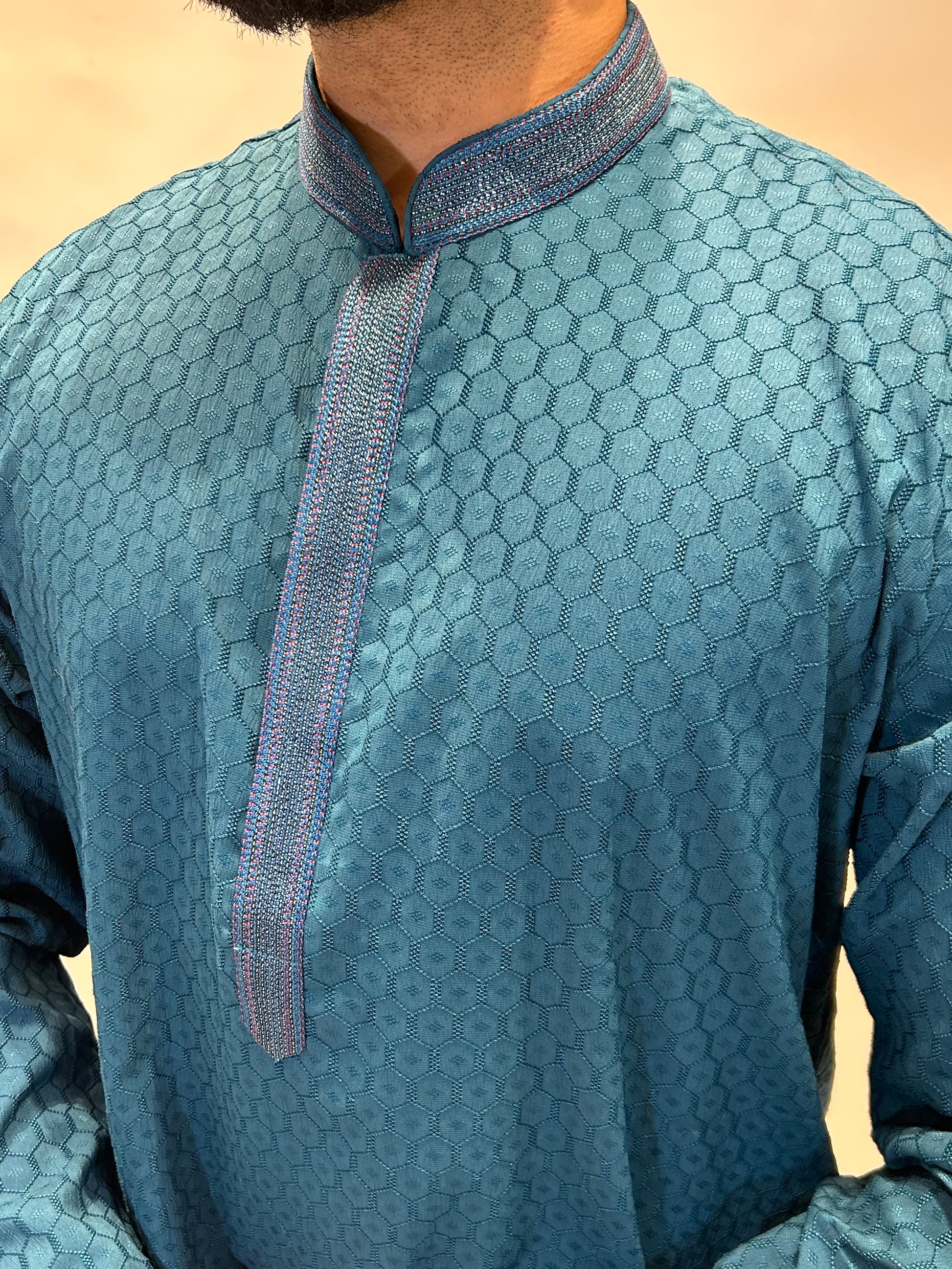 Dignified, modern, and richly textured — this Teal Thread Self-Jaal Patterned Kurta Set in a striking teal tone brings a balance of festive elegance and everyday refinement. The intricate self-jaal weave offers a subtle play of texture, while the matching thread detailing along the placket and collar elevates its classic silhouette with contemporary charm.