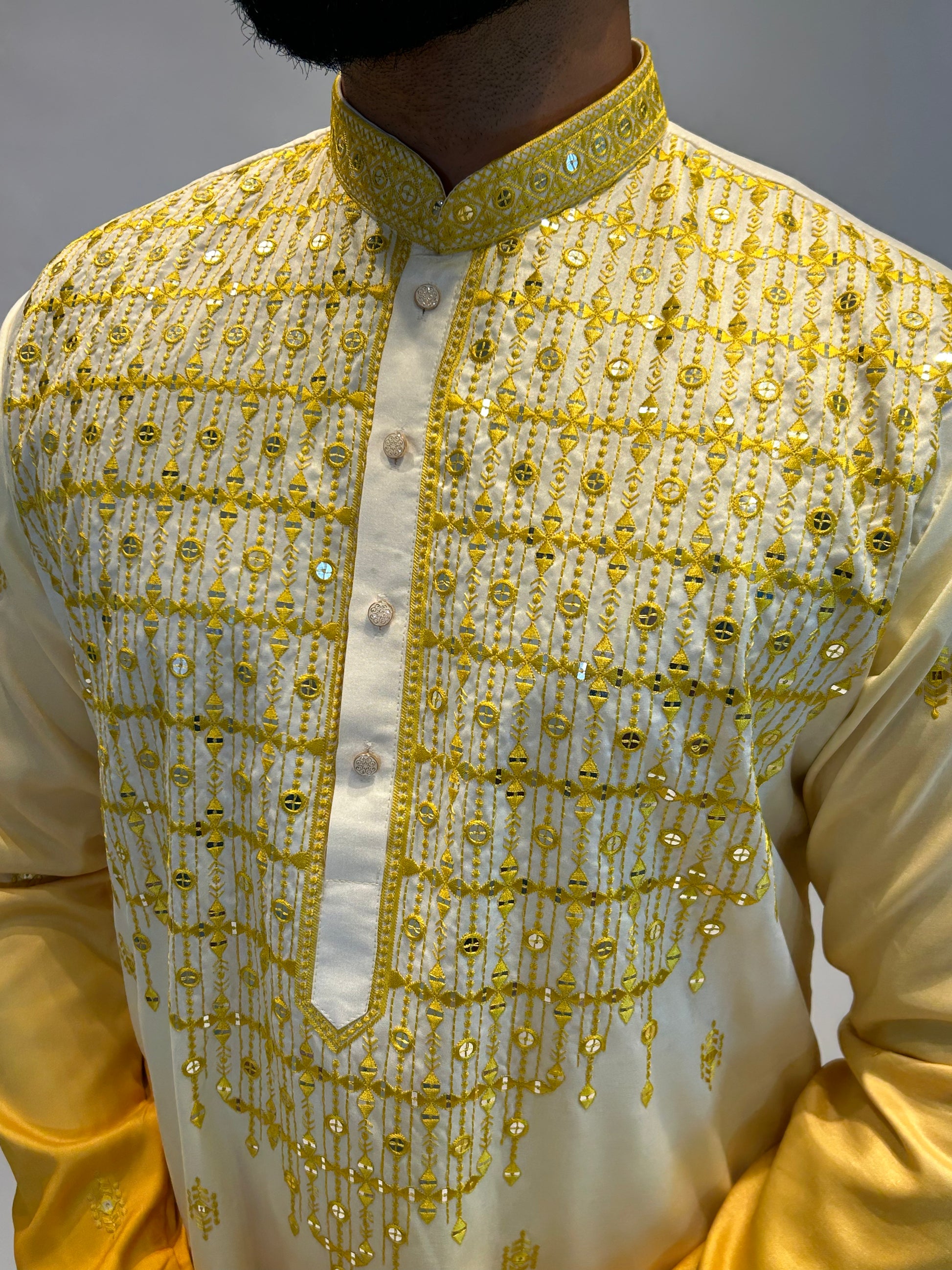 - Embroidery: Yellow tone-on-tone threadwork with light reflective embellishments