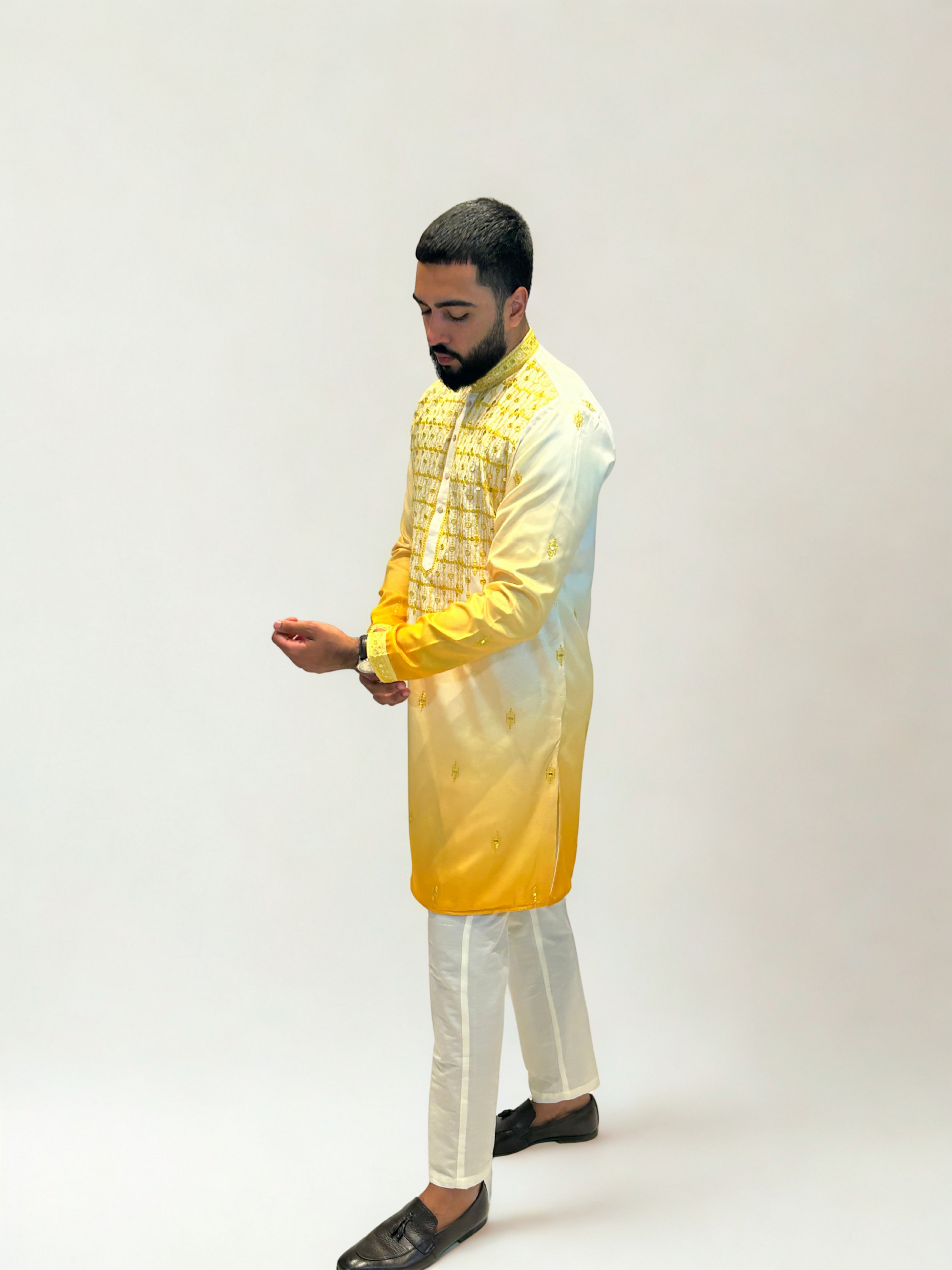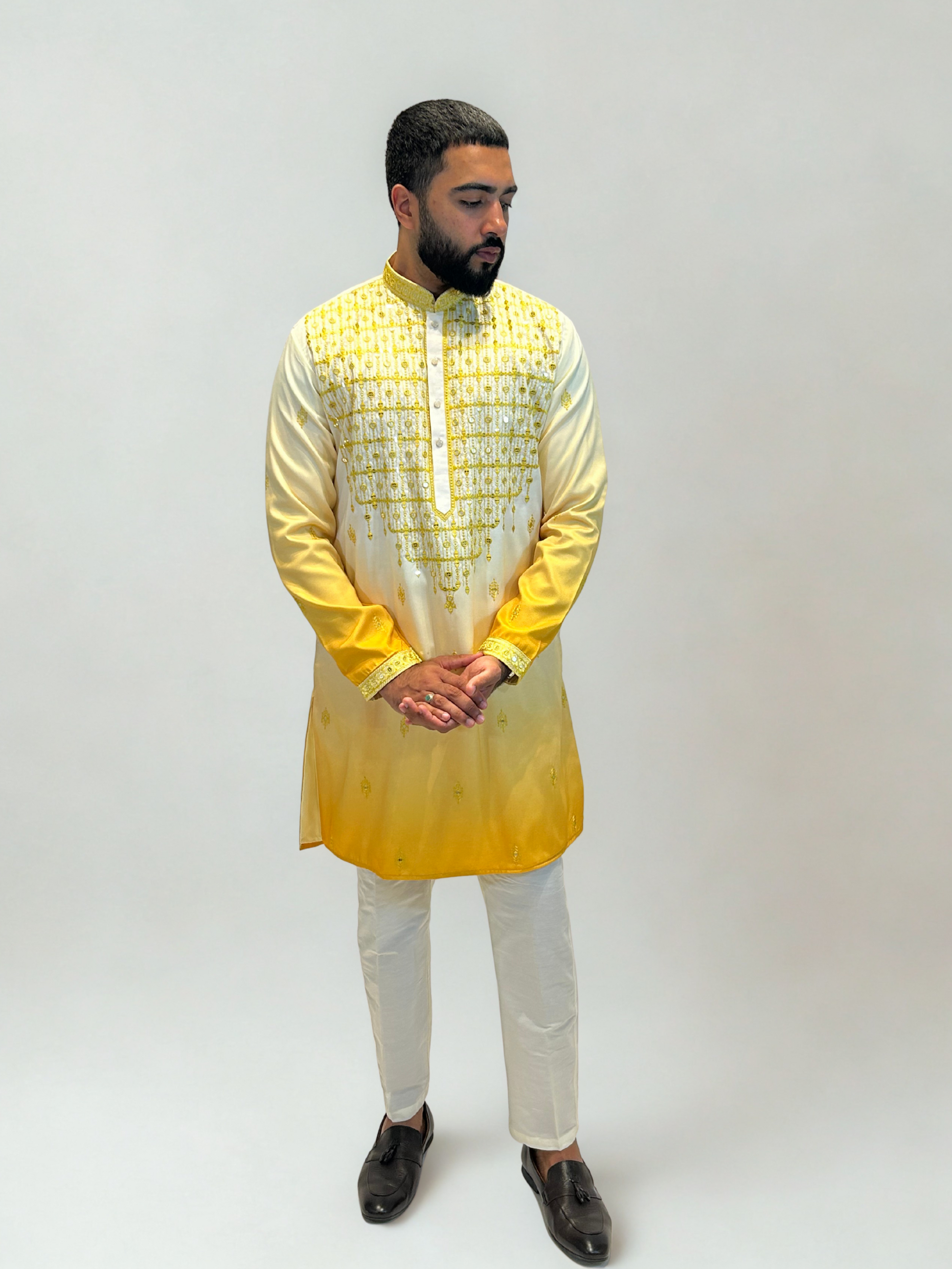 Celebrate tradition in style with our Ivory & Yellow Ombre Embroidered Kurta Set. This radiant ensemble features a smooth ivory base that flows into a vibrant yellow gradient, highlighted by detailed tonal embroidery and subtle sequin work.