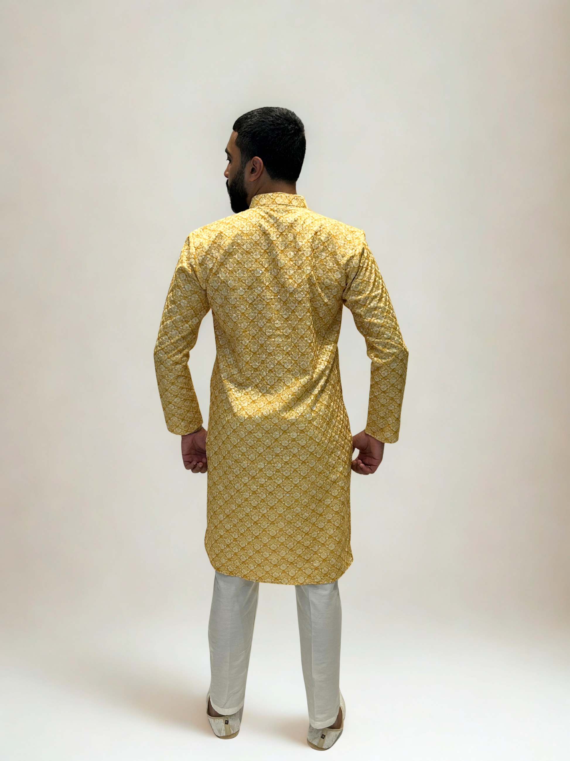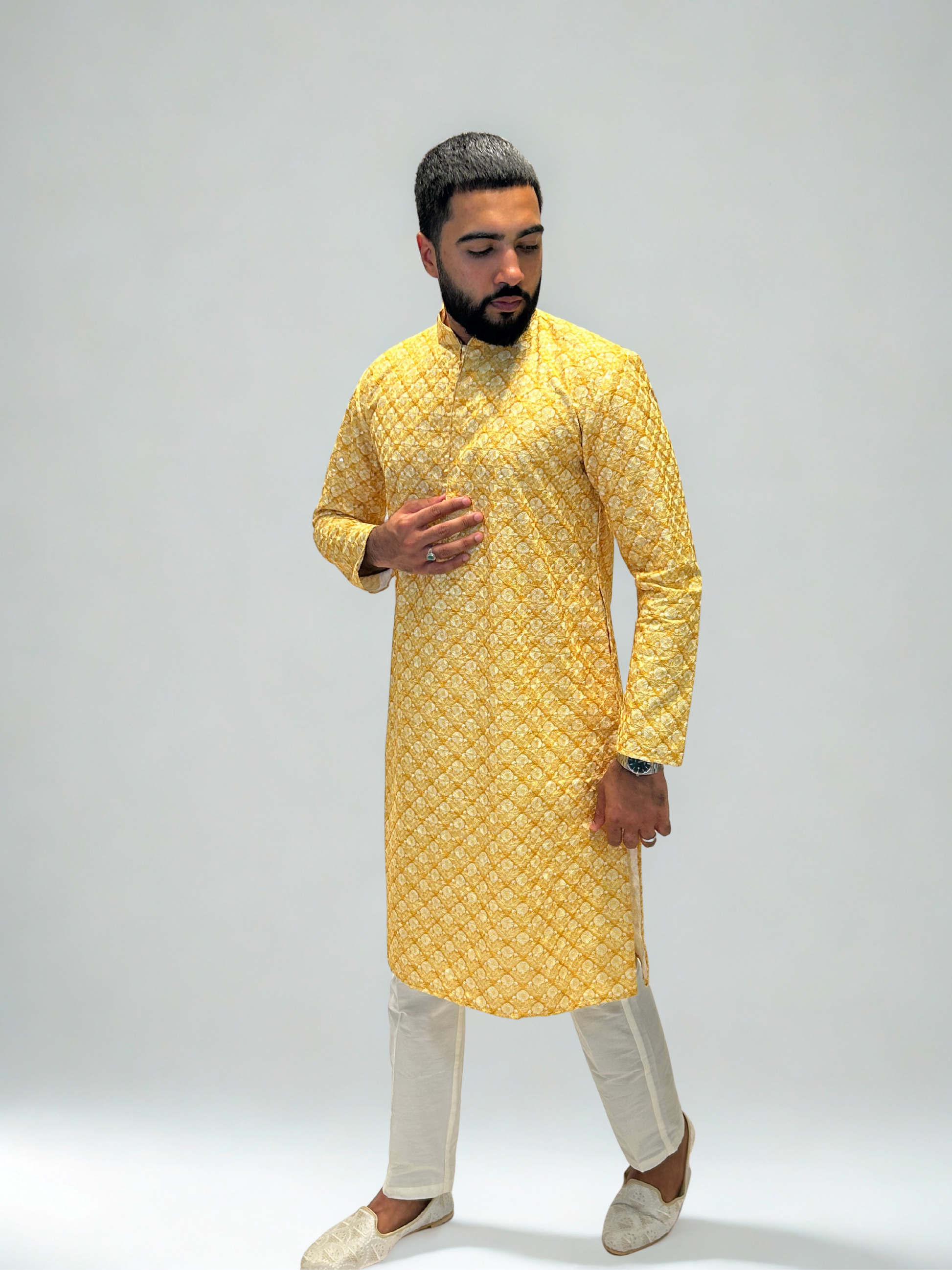 Celebrate tradition with a modern twist in our Yellow & Mustard Printed Embroidered Kurta Set. This statement piece combines a bold printed base with detailed thread embroidery and clear sequins, creating depth, dimension, and festive brilliance.
